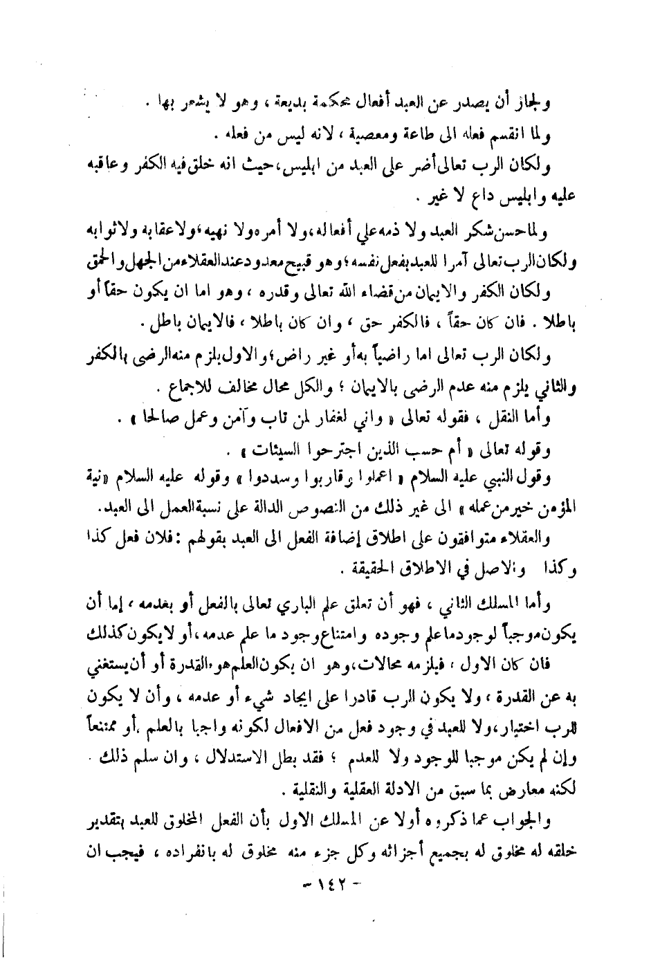 وَلَجَازَ أَنْ يَصْدُرَ عَنِ الْعَبْدِ أَفْعَالٌ مَحْكَمَةٌ بَدِيعَةٌ وَهُوَ لَا يَشْعُرُ بِهَا، وَلَمَا انْقَسَمَ فِعْلُهُ إِلَى طَاعَةٍ وَمَعْصِيَةٍ ; لِأَنَّهُ لَيْسَ مِنْ فِعْلِهِ، وَلَكَانَ الرَّبُّ تَعَالَى أَضَرَّ عَلَى الْعَبْدِ مِنْ إِبْلِيسَ ; حَيْثُ إِنَّهُ خَلَقَ فِيهِ الْكُفْرَ وَعَاقَبَهُ عَلَيْهِ وَإِبْلِيسُ دَاعٍ لَا غَيْرُ، وَلَمَا حَسُنَ شُكْرُ الْعَبْدِ وَلَا ذَمُّهُ عَلَى أَفْعَالِهِ وَلَا أَمْرُهُ وَلَا نَهْيُهُ وَلَا عِقَابُهُ وَلَا ثَوَابُهُ، وَلَكَانَ الرَّبُّ تَعَالَى آمِرًا لِلْعَبْدِ بِفِعْلِ نَفْسِهِ وَهُوَ قَبِيحٌ مَعْدُودٌ عِنْدَ الْعُقَلَاءِ مِنَ الْجَهْلِ وَالْحُمْقِ، وَلَكَانَ الْكُفْرُ وَالْإِيمَانُ مِنْ قَضَاءِ اللَّهِ تَعَالَى وَقَدَرِهِ، وَهُوَ إِمَّا أَنْ يَكُونَ حَقًّا أَوْ بَاطِلًا: فَإِنْ كَانَ حَقًّا فَالْكُفْرُ حَقٌّ، وَإِنْ كَانَ بَاطِلًا فَالْإِيمَانُ بَاطِلٌ. وَلَكَانَ الرَّبُّ تَعَالَى إِمَّا رَاضِيًا بِهِ رَاضٍ أَوْ غَيْرَ رَاضٍ، وَالْأَوَّلُ يَلْزَمُ مِنْهُ الرِّضَا بِالْكُفْرِ وَالثَّانِي يَلْزَمُ مِنْهُ عَدَمُ الرِّضَا بِالْإِيمَانِ، وَالْكُلُّ مُحَالٌ مُخَالِفٌ لِلْإِجْمَاعِ.