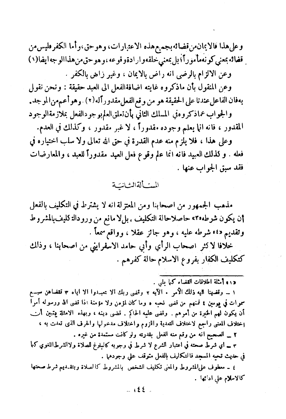 وَعَلَى هَذَا فَالْإِيمَانُ مِنْ قَضَائِهِ بِجَمِيعِ هَذِهِ الِاعْتِبَارَاتِ وَهُوَ حَقٌّ، وَأَمَّا الْكُفْرُ فَلَيْسَ مِنْ قَضَائِهِ بِمَعْنَى كَوْنِهِ مَأْمُورًا بَلْ بِمَعْنَى خَلْقِهِ وَإِرَادَةِ وُقُوعِهِ، وَهُوَ حَقٌّ مِنْ هَذَا الْوَجْهِ أَيْضًا. (١) وَعَنِ الْإِلْزَامِ بِالرِّضَا أَنَّهُ رَاضٍ بِالْإِيمَانِ، وَغَيْرُ رَاضٍ بِالْكُفْرِ.