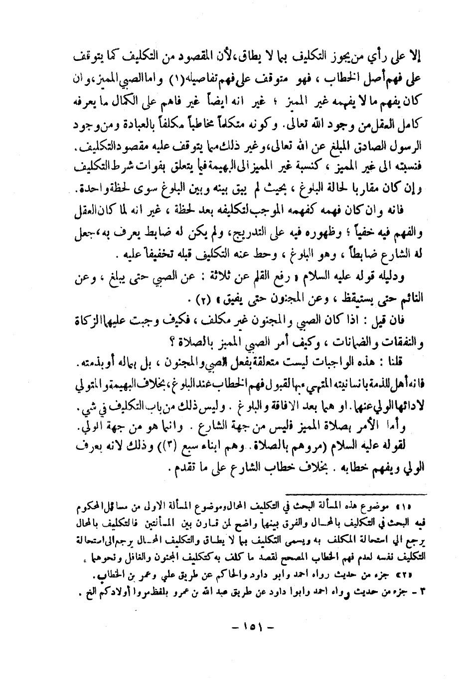 وَأَمَّا الصَّبِيُّ الْمُمَيِّزُ وَإِنْ كَانَ يَفْهَمُ مَا لَا يَفْهَمُهُ غَيْرُ الْمُمَيِّزِ، غَيْرَ أَنَّهُ أَيْضًا غَيْرُ فَاهِمٍ عَلَى الْكَمَالِ مَا يَعْرِفُهُ كَامِلُ الْعَقْلِ مِنْ وُجُودِ اللَّهِ تَعَالَى، وَكَوْنِهِ مُتَكَلِّمًا مُخَاطَبًا مُكَلَّفًا بِالْعِبَادَةِ وَمِنْ وُجُودِ الرَّسُولِ الصَّادِقِ الْمُبَلِّغِ عَنِ اللَّهِ تَعَالَى، وَغَيْرِ ذَلِكَ مِمَّا يَتَوَقَّفُ عَلَيْهِ مَقْصُودُ التَّكْلِيفِ.