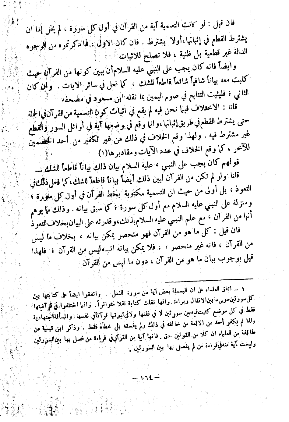(١) اتَّفَقَ الْعُلَمَاءُ عَلَى أَنَّ الْبَسْمَلَةَ بَعْضُ آيَةٍ مِنْ سُورَةِ النَّمْلِ، وَاتَّفَقُوا أَيْضًا عَلَى كِتَابَتِهَا بَيْنَ كُلِّ سُورَتَيْنِ سِوَى مَا بَيْنَ الْأَنْفَالِ وَبَرَاءَةَ، وَأَنَّهَا نُقِلَتْ كِتَابَةً نَقْلًا مُتَوَاتِرًا، وَإِنَّمَا اخْتَلَفُوا فِي قُرْآنِيَّتِهَا فَقَطْ فِي كُلِّ مَوْضِعٍ كُتِبَتْ فِيهِ بَيْنَ سُورَتَيْنِ لَا فِي نَقْلِهَا، وَلَا فِي ثُبُوتِهَا قُرْآنًا فِي نَفْسِهَا، وَالْمَسْأَلَةُ اجْتِهَادِيَّةٌ، وَلِذَا لَمْ يُكَفِّرْ أَحَدٌ مِنَ الْأَئِمَّةِ مَنْ خَالَفَهُ فِي ذَلِكَ، وَلَمْ يُفَسِّقْهُ بَلْ خَطَّأَهُ فَقَطْ. وَذَكَرَ ابْنُ تَيْمِيَّةَ عَنْ طَائِفَةٍ مِنَ الْعُلَمَاءِ أَنَّ كُلًّا مِنَ الْقَوْلَيْنِ حَقٌ ; فَإِنَّهَا آيَةٌ مِنَ الْقُرْآنِ فِي قِرَاءَةِ مَنْ فَصَلَ بِهَا بَيْنَ السُّورَتَيْنِ، وَلَيْسَتْ آيَةً مِنْهُ فِي قِرَاءَةِ مَنْ لَمْ يَفْصِلْ بَيْنَ السُّورَتَيْنِ.
