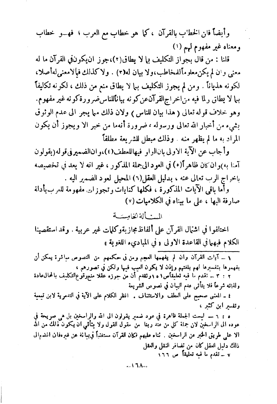 (١) آيَاتُ الْقُرْآنِ وَإِنْ لَمْ يَفْهَمْهَا الْعَجَمُ، وَمَنْ فِي حُكْمِهِمْ مِنَ النُّصُوصِ مُبَاشَرَةٌ يُمْكِنُ أَنْ يَفْهَمُوهَا بِتَفْسِيرِهَا لَهُمْ بِلُغَتِهِمْ، وَإِذَنْ لَا يَكُونُ الْعَيْبُ فِيهَا، وَلَكِنْ فِي تَصَوُّرِهِمْ.