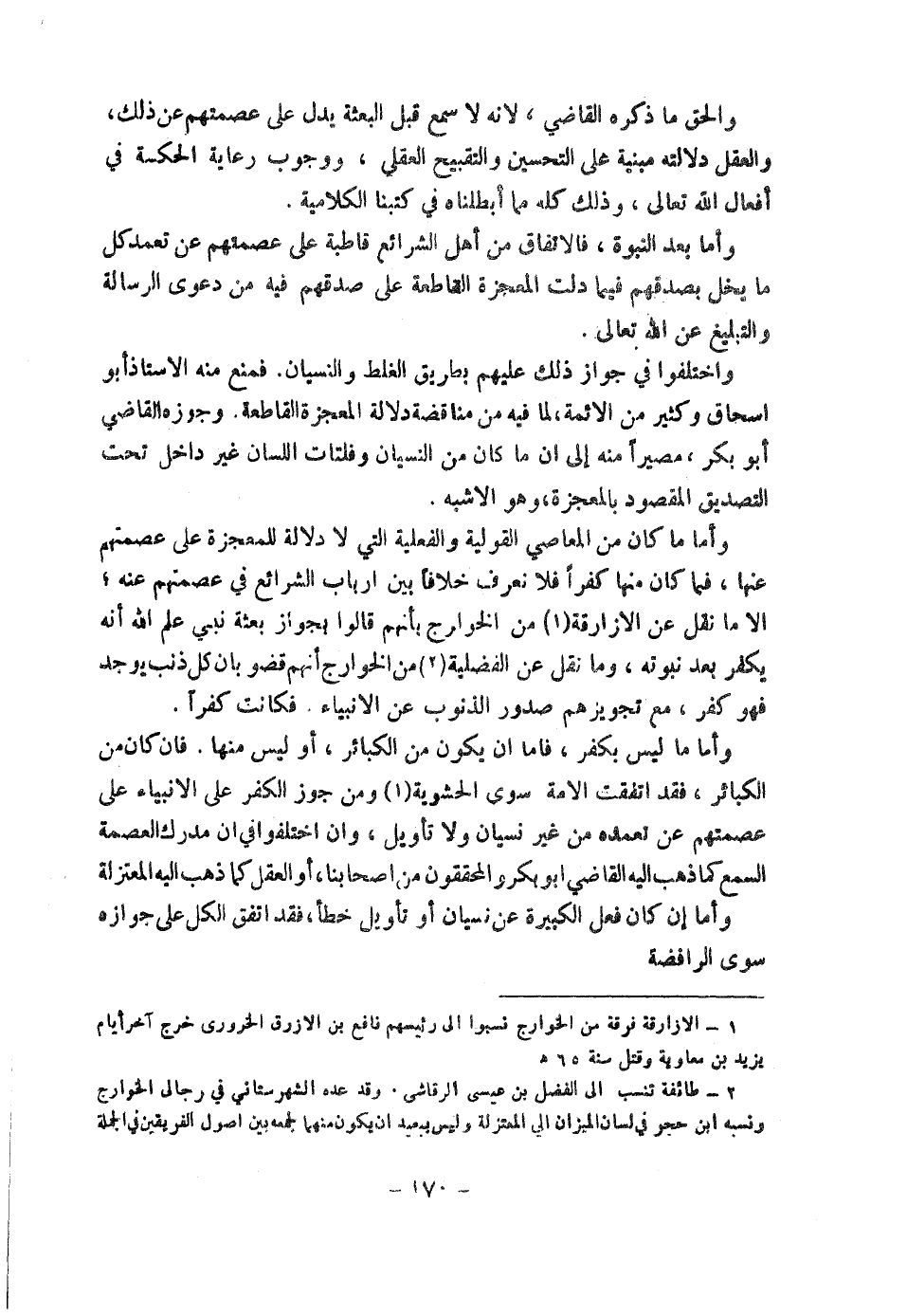 وَأَمَّا مَا كَانَ مِنَ الْمَعَاصِي الْقَوْلِيَّةِ وَالْفِعْلِيَّةِ الَّتِي لَا دَلَالَةَ لِلْمُعْجِزَةِ عَلَى عِصْمَتِهِمْ عَنْهَا، فَمَا كَانَ مِنْهَا كُفْرًا فَلَا نَعْرِفُ خِلَافًا بَيْنَ أَرْبَابِ الشَّرَائِعِ فِي عِصْمَتِهِمْ عَنْهُ، إِلَّا مَا نُقِلَ عَنِ الْأَزَارِقَةِ (١) . مِنَ الْخَوَارِجِ أَنَّهُمْ قَالُوا بِجَوَازِ بَعْثَةِ نَبِيٍّ عَلِمَ اللَّهُ أَنَّهُ يَكْفُرُ بَعْدَ نُبُوَّتِهِ، وَمَا نُقِلَ عَنِ الْفَضْلِيَّةِ (٢) . مِنَ الْخَوَارِجِ أَنَّهُمْ قَضَوْا بِأَنَّ كُلَّ ذَنْبٍ يُوجَدُ فَهُوَ كُفْرٌ مَعَ تَجْوِيزِهِمْ صُدُورَ الذُّنُوبِ عَنِ الْأَنْبِيَاءِ، فَكَانَتْ كُفْرًا.