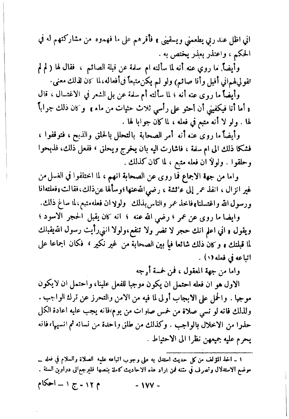 وَأَيْضًا مَا رُوِيَ عَنْ عُمَرَ رَضِيَ اللَّهُ عَنْهُ أَنَّهُ كَانَ يُقَبِّلُ الْحَجَرَ الْأَسْوَدَ وَيَقُولُ: " «إِنِّي أَعْلَمُ أَنَّكَ حَجَرٌ لَا تَضُرُّ وَلَا تَنْفَعُ وَلَوْلَا أَنَّنِي رَأَيْتُ رَسُولَ اللَّهِ يُقَبِّلُكَ لَمَا قَبَّلْتُكَ» "، وَكَانَ ذَلِكَ شَائِعًا فِيمَا بَيْنُ الصَّحَابَةِ مِنْ غَيْرِ نَكِيرٍ، فَكَانَ إِجْمَاعًا عَلَى اتِّبَاعِهِ فِي فِعْلِهِ (١) .