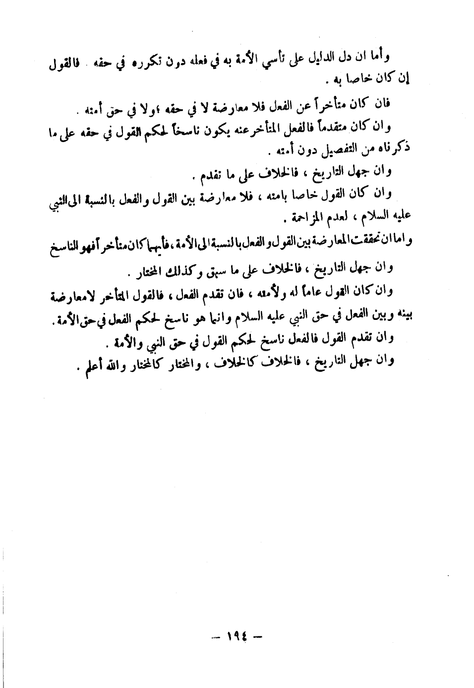 وَأَمَّا إِنْ دَلَّ الدَّلِيلُ عَلَى تَأَسِّي الْأُمَّةِ بِهِ فِي فِعْلِهِ دُونَ تَكَرُّرِهِ فِي حَقِّهِ، فَالْقَوْلُ إِنْ كَانَ خَاصًّا بِهِ، فَإِنْ كَانَ مُتَأَخِّرًا عَنِ الْفِعْلِ فَلَا مُعَارَضَةَ لَا فِي حَقِّهِ وَلَا فِي حَقِّ أُمَّتِهِ، وَإِنْ كَانَ مُتَقَدِّمًا فَالْفِعْلُ الْمُتَأَخِّرُ عَنْهُ يَكُونُ نَاسِخًا لِحُكْمِ الْقَوْلِ فِي حَقِّهِ عَلَى مَا ذَكَرْنَاهُ مِنَ التَّفْصِيلِ دُونَ أُمَّتِهِ.