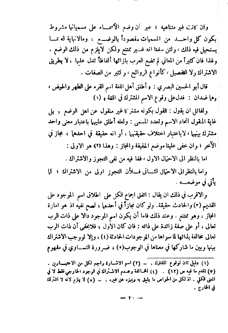 وَقَالَ أَبُو الْحُسَيْنِ الْبَصْرِيُّ: " أَطْلَقَ أَهْلُ اللُّغَةِ اسْمَ الْقُرْءِ عَلَى الطُّهْرِ وَالْحَيْضِ وَهُمَا ضِدَّانِ، فَدَلَّ عَلَى وُقُوعِ الِاسْمِ الْمُشْتَرَكِ فِي اللُّغَةِ ". (١) وَلِقَائِلٍ أَنْ يَقُولَ: الْقَوْلُ بِكَوْنِهِ مُشْتَرَكًا غَيْرُ مَنْقُولٍ عَنْ أَهْلِ الْوَضْعِ، بَلْ غَايَةُ الْمَنْقُولِ اتِّحَادُ الِاسْمِ وَتَعَدُّدُ الْمُسَمَّى، وَلَعَلَّهُ أُطْلِقَ عَلَيْهِمَا بِاعْتِبَارِ مَعْنًى وَاحِدٍ مُشْتَرَكٍ بَيْنَهُمَا، لَا بِاعْتِبَارِ اخْتِلَافِ حَقِيقَتِهِمَا، أَوْ أَنَّهُ حَقِيقَةٌ فِي أَحَدِهِمَا مَجَازٌ فِي الْآخَرِ، وَإِنْ خَفِيَ مَوْضِعُ الْحَقِيقَةِ وَالْمَجَازِ، وَهَذَا (٢) هُوَ الْأَوْلَى.