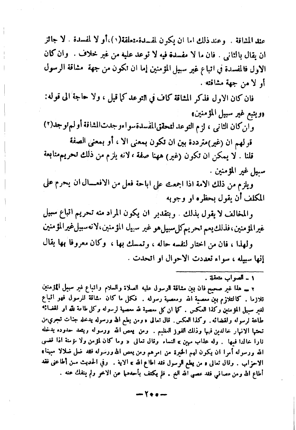 لَا جَائِزٌ أَنْ يُقَالَ بِالثَّانِي: فَإِنَّ مَا لَا مَفْسَدَةَ فِيهِ لَا تَوَعُّدَ عَلَيْهِ مِنْ غَيْرِ خِلَافٍ، وَإِنْ كَانَ الْأَوَّلَ فَالْمَفْسَدَةُ فِي اتِّبَاعِ غَيْرِ سَبِيلِ الْمُؤْمِنِينَ إِمَّا أَنْ تَكُونَ مِنْ جِهَةِ مُشَاقَّةِ الرَّسُولِ أَوْ لَا مِنْ جِهَةِ مُشَاقَّتِهِ.