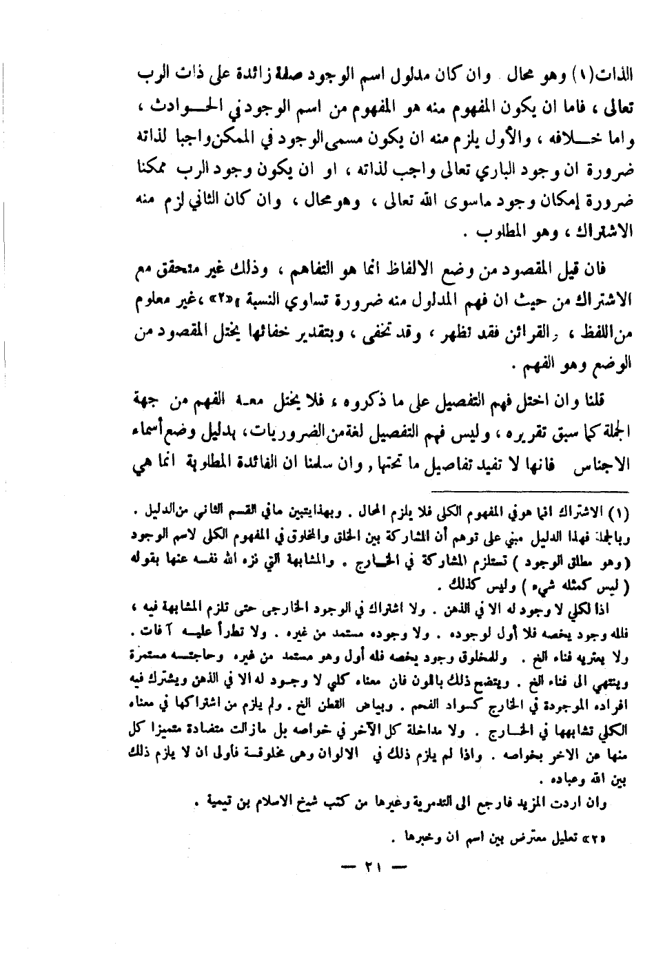 (١) الِاشْتِرَاكُ إِنَّمَا هُوَ فِي الْمَفْهُومِ الْكُلِّيِّ فَلَا يَلْزَمُ الْمُحَالُ، وَبِهَذَا يَتَبَيَّنُ مَا فِي الْقِسْمِ الثَّانِي مِنَ الدَّلِيلِ. وَبِالْجُمْلَةِ فَهَذَا الدَّلِيلُ مَبْنِيٌّ عَلَى تَوَهُّمِ أَنَّ الْمُشَارَكَةَ بَيْنَ الْخَلْقِ وَالْمَخْلُوقِ فِي الْمَفْهُومِ الْكُلِّيِّ لِاسْمِ الْوُجُودِ (وَهُوَ مُطْلَقُ الْوُجُودِ) تَسْتَلْزِمُ الْمُشَارَكَةَ فِي الْخَارِجِ، وَالْمُشَابَهَةَ الَّتِي نَزَّهَ اللَّهُ نَفْسَهُ عَنْهَا بِقَوْلِهِ: (لَيْسَ كَمِثْلِهِ شَيْءٌ) وَلَيْسَ كَذَلِكَ. إِذِ الْكُلِّيُّ لَا وُجُودَ لَهُ إِلَّا فِي الذِّهْنِ، وَلَا اشْتِرَاكَ فِي الْوُجُودِ الْخَارِجِيِّ حَتَّى تَلْزَمَ الْمُشَابَهَةُ فِيهِ، فَلِلَّهِ وُجُودٌ يَخُصُّهُ فَلَا أَوَّلَ لِوُجُودِهِ، وَلَا وُجُودَ مُسْتَمَدٌّ مِنْ غَيْرِهِ، وَلَا تَطْرَأُ عَلَيْهِ آفَاتٌ، وَلَا يَعْتَرِيهِ فَنَاءٌ إِلَخْ. وَلِلْمَخْلُوقِ وُجُودٌ يَخُصُّهُ فَلَهُ أَوَّلٌ وَهُوَ مُسْتَمَدٌّ مِنْ غَيْرِهِ وَحَاجَتُهُ مُسْتَمِرَّةٌ وَيَنْتَهِي إِلَى فَنَاءٍ إِلَخْ. وَيَتَّضِحُ ذَلِكَ بِاللَّوْنِ فَإِنَّ مَعْنَاهُ كُلِّيٌّ لَا وُجُودَ لَهُ إِلَّا فِي الذِّهْنِ وَيَشْتَرِكُ فِيهِ أَفْرَادُهُ الْمَوْجُودَةُ فِي الْخَارِجِ كَسَوَادِ الْفَحْمِ، وَبَيَاضِ الْقُطْنِ إِلَخْ. وَلَمْ يَلْزَمْ مِنَ اشْتِرَاكِهَا فِي مَعْنَاهُ الْكُلِّيِّ تَشَابُهُهَا فِي الْخَارِجِ، وَلَا مُدَاخَلَةُ كُلٍّ الْآخَرَ فِي خَوَاصِّهِ بَلْ مَا زَالَتْ مُتَضَادَّةً مُتَمَيِّزًا كُلٌّ مِنْهُمَا عَنِ الْآخَرِ بِخَوَاصِّهِ. وَإِذَا لَمْ يَلْزَمْ ذَلِكَ فِي الْأَلْوَانِ وَهِيَ مَخْلُوقَةٌ فَأَوْلَى أَنْ لَا يَلْزَمَ ذَلِكَ بَيْنَ اللَّهِ وَعِبَادِهِ.