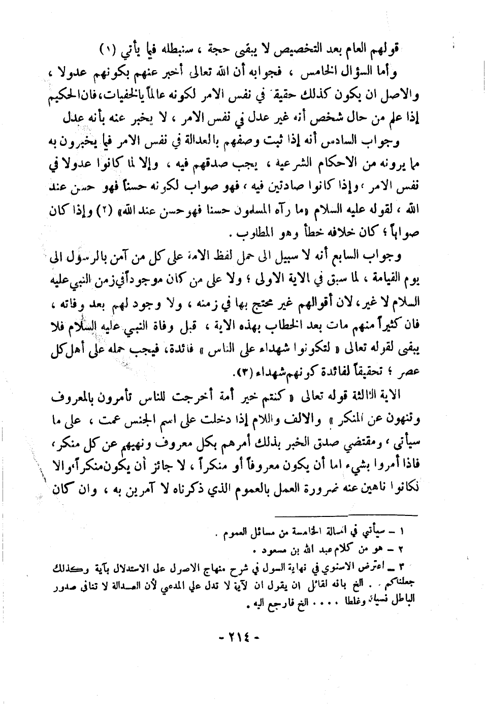 (٣) اعْتَرَضَ الْإِسْنَوِيُّ فِي " نِهَايَةِ السُّولِ فِي شَرْحِ مِنْهَاجِ الْأُصُولِ " عَلَى الِاسْتِدْلَالِ بِآيَةِ " وَكَذَلِكَ جَعَلْنَاكُمْ. . . " إِلَخْ. بِأَنَّهُ لِقَائِلٍ أَنْ يَقُولَ: إِنَّ الْآيَةَ لَا تَدُلُّ عَلَى الْمُدَّعِي ; لِأَنَّ الْعَدَالَةَ لَا تُنَافِي صُدُورَ الْبَاطِلِ نِسْيَانًا وَغَلَطًا. . . إِلَخْ، فَارْجِعْ إِلَيْهِ.