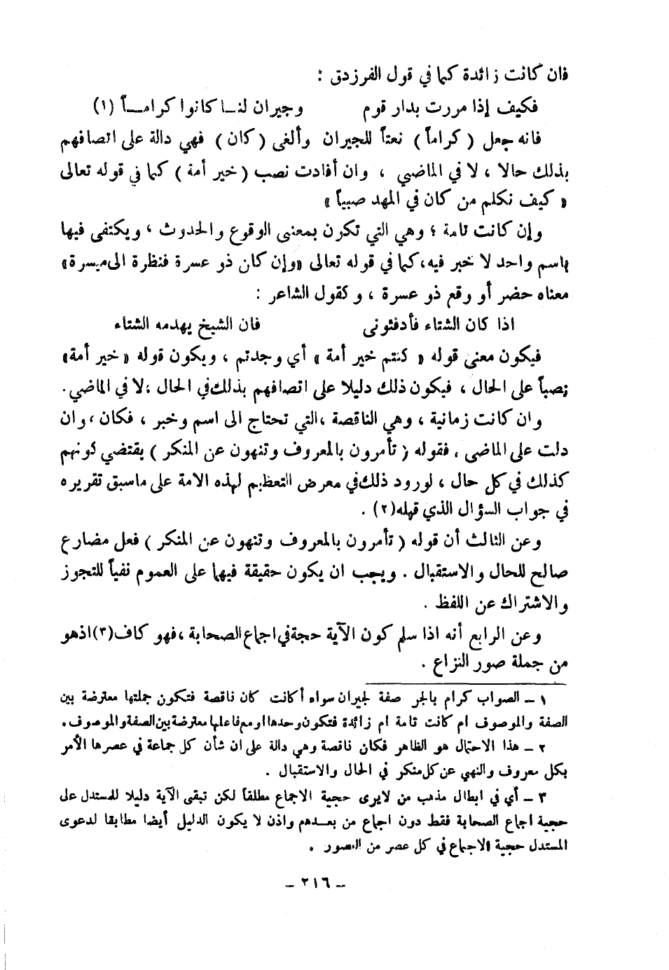(٢) هَذَا الِاحْتِمَالُ هُوَ الظَّاهِرُ، فَكَانَ نَاقِصَةٌ، وَهِيَ دَالَّةٌ عَلَى أَنَّ شَأْنَ كُلِّ جَمَاعَةٍ فِي عَصْرِهَا الْأَمْرُ بِكُلِّ مَعْرُوفٍ وَالنَّهْيُ عَنْ كُلِّ مُنْكَرٍ فِي الْحَالِ وَالِاسْتِقْبَالِ.