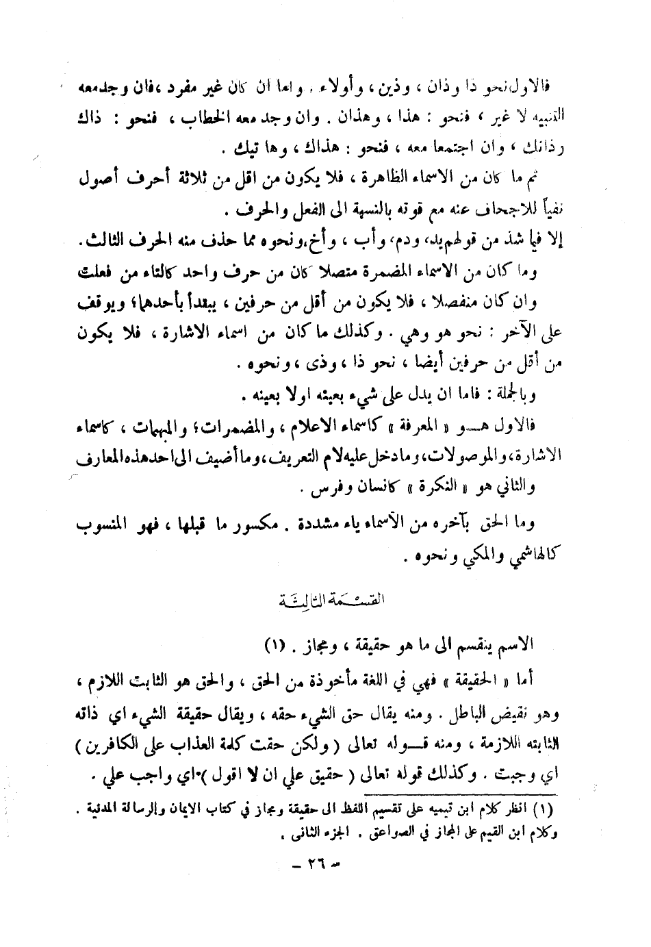 (١) انْظُرْ كَلَامَ ابْنِ تَيْمِيَّةَ عَلَى تَقْسِيمِ اللَّفْظِ إِلَى حَقِيقَةٍ وَمَجَازٍ فِي كِتَابِ الْإِيمَانِ وَالرِّسَالَةِ الْمَدَنِيَّةِ، وَكَلَامَ ابْنِ الْقِيَمِ عَلَى الْمَجَازِ فِي الصَّوَاعِقِ، الْجُزْءُ الثَّانِي.