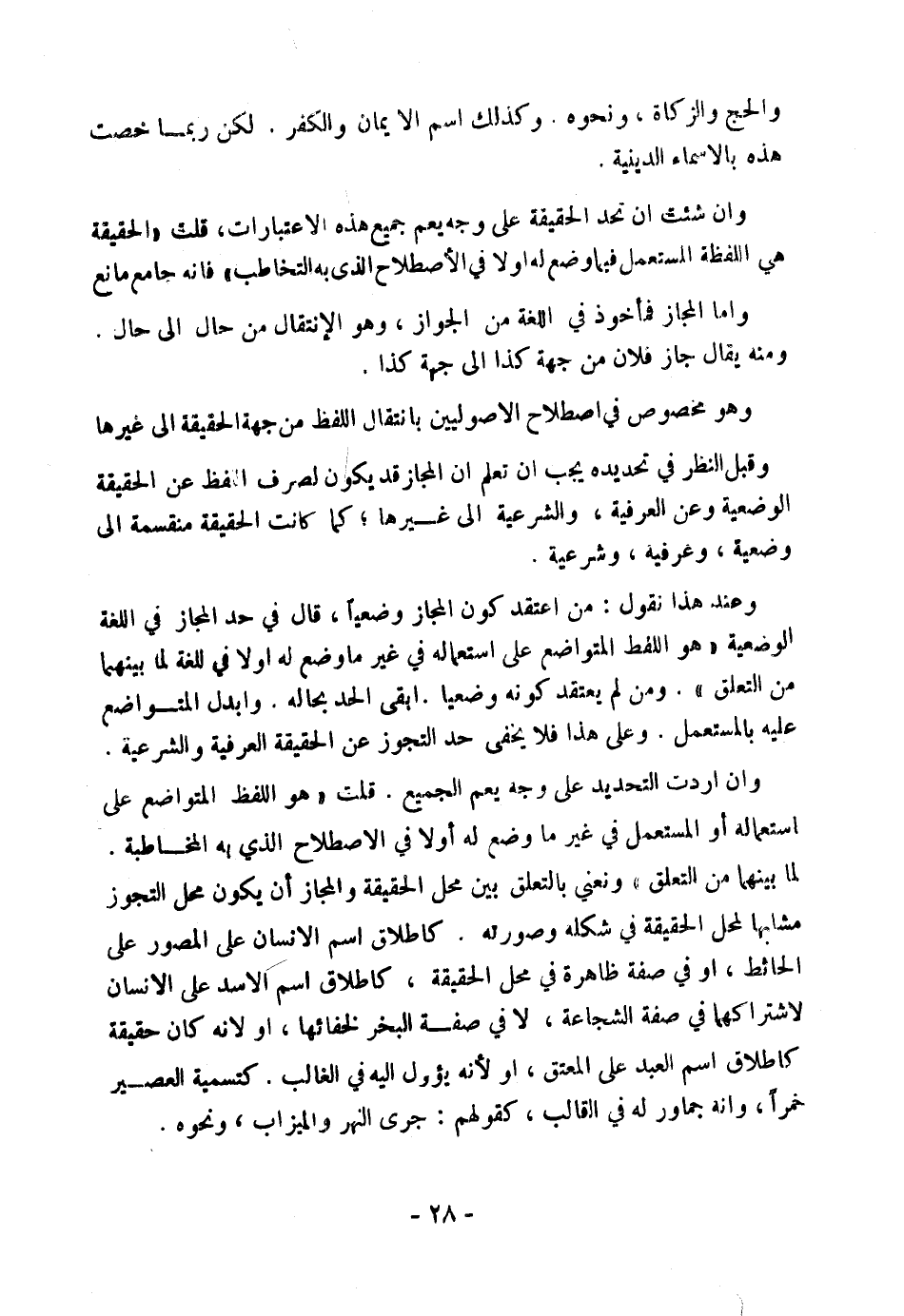 وَإِنْ أَرَدْتَ التَّحْدِيدَ عَلَى وَجْهٍ يَعُمُّ الْجَمِيعَ قُلْتَ: " هُوَ اللَّفْظُ الْمُتَوَاضَعُ عَلَى اسْتِعْمَالِهِ أَوِ الْمُسْتَعْمَلُ فِي غَيْرِ مَا وُضِعَ لَهُ أَوَّلًا فِي الِاصْطِلَاحِ الَّذِي بِهِ الْمُخَاطَبَةُ، لِمَا بَيْنَهُمَا مِنَ التَّعَلُّقِ " وَنَعْنِي بِالتَّعَلُّقِ بَيْنَ مَحَلِّ الْحَقِيقَةِ وَالْمَجَازِ أَنْ يَكُونَ مَحَلُّ التَّجَوُّزِ مُشَابِهًا لِمَحَلِّ الْحَقِيقَةِ فِي شَكْلِهِ وَصُورَتِهِ كَإِطْلَاقِ اسْمِ الْإِنْسَانِ عَلَى الْمُصَوِّرِ عَلَى الْحَائِطِ، أَوْ فِي صِفَةٍ ظَاهِرَةٍ فِي مَحَلِّ الْحَقِيقَةِ كَإِطْلَاقِ اسْمِ الْأَسَدِ عَلَى الْإِنْسَانِ لِاشْتِرَاكِهِمَا فِي صِفَةِ الشَّجَاعَةِ لَا فِي صِفَةِ الْبَخْرِ لِخَفَائِهَا، أَوْ لِأَنَّهُ كَانَ حَقِيقَةً كَإِطْلَاقِ اسْمِ الْعَبْدِ عَلَى الْمُعْتَقِ؛ أَوْ لِأَنَّهُ يَؤُولُ إِلَيْهِ فِي الْغَالِبِ كَتَسْمِيَةِ الْعَصِيرِ خَمْرًا، أَوْ أَنَّهُ مُجَاوِرٌ لَهُ فِي الْغَالِبِ كَقَوْلِهِمْ: جَرَى النَّهْرُ وَالْمِيزَابُ وَنَحْوُهُ.