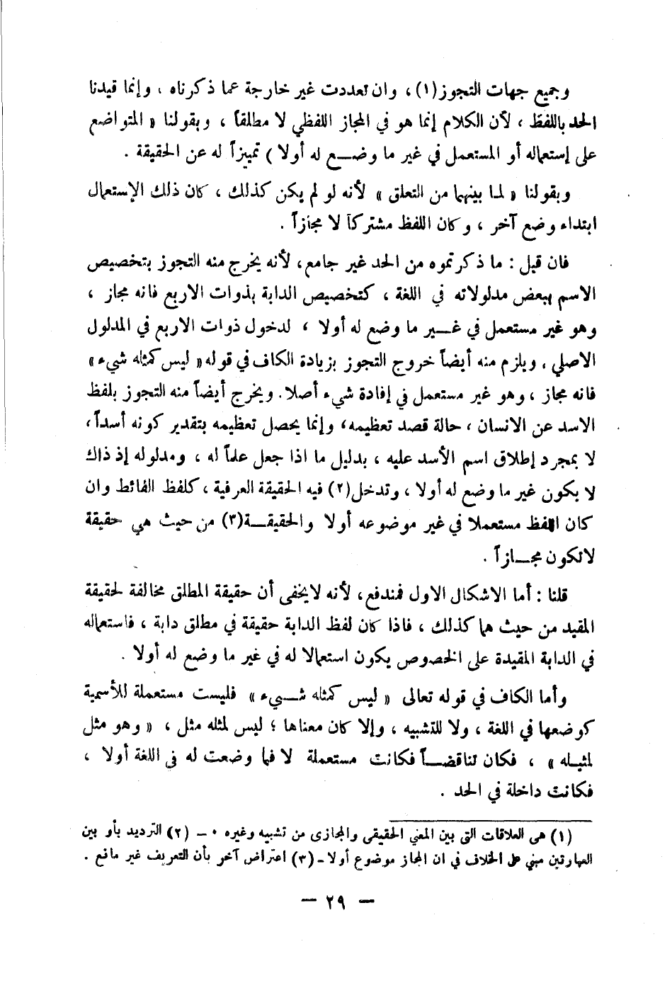 (٢) التَّرْدِيدُ بَأَوْ بَيْنَ الْعِبَارَتَيْنِ مَبْنِيٌّ عَلَى الْخِلَافِ فِي أَنَّ الْمَجَازَ مَوْضُوعٌ أَوَّلًا.