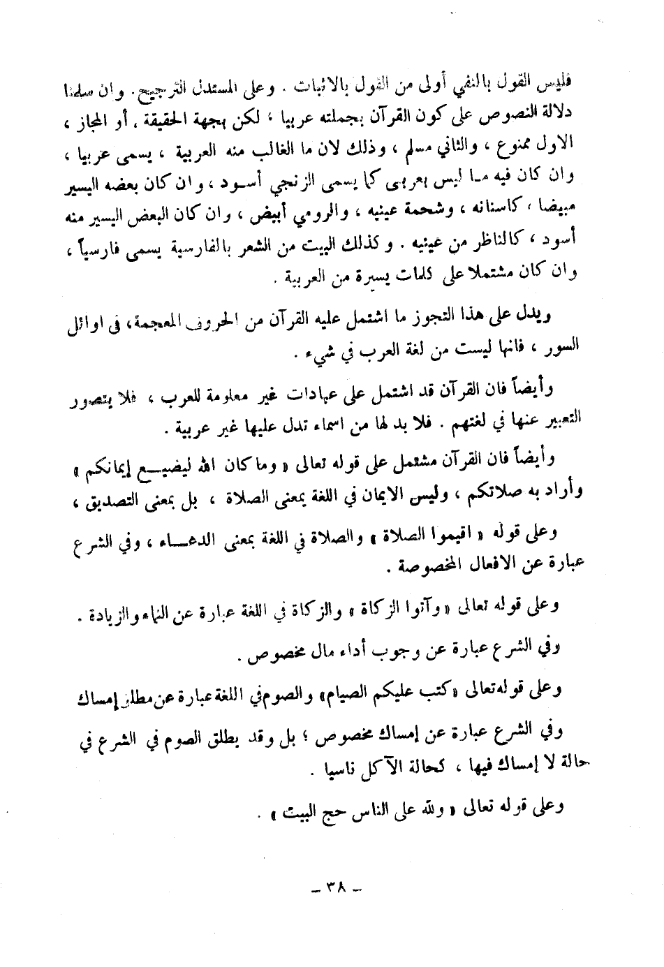 فَلَيْسَ الْقَوْلُ بِالنَّفْيِ أَوْلَى مِنَ الْقَوْلِ بِالْإِثْبَاتِ، وَعَلَى الْمُسْتَدِلِّ التَّرْجِيحُ. وَإِنْ سَلَّمْنَا دَلَالَةَ النُّصُوصِ عَلَى كَوْنِ الْقُرْآنِ بِجُمْلَتِهِ عَرَبِيًّا، لَكِنْ بِجِهَةِ الْحَقِيقَةِ أَوِ الْمَجَازِ، الْأَوَّلُ مَمْنُوعٌ، وَالثَّانِي مُسَلَّمٌ ; وَذَلِكَ لِأَنَّ مَا الْغَالِبُ مِنْهُ الْعَرَبِيَّةُ يُسَمَّى عَرَبِيًّا، وَإِنْ كَانَ فِيهِ مَا لَيْسَ بِعَرَبِيٍّ كَمَا يُسَمَّى الزِّنْجِيُّ أَسْوَدَ، وَإِنْ كَانَ بَعْضُهُ الْيَسِيرُ مُبْيَضًّا كَأَسْنَانِهِ وَشَحْمَةِ عَيْنَيْهِ، وَالرُّومِيُّ أَبْيَضَ، وَإِنْ كَانَ الْبَعْضُ الْيَسِيرُ مِنْهُ أَسْوَدَ كَالنَّاظِرِ مِنْ عَيْنَيْهِ. وَكَذَلِكَ الْبَيْتُ مِنَ الشِّعْرِ بِالْفَارِسِيَّةِ يُسَمَّى فَارِسِيًّا وَإِنْ كَانَ مُشْتَمِلًا عَلَى كَلِمَاتٍ يَسِيرَةٍ مِنَ الْعَرَبِيَّةِ.