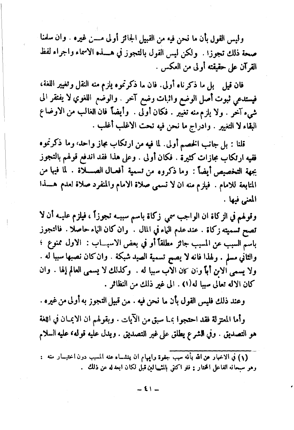 وَلَيْسَ الْقَوْلُ بِأَنَّ مَا نَحْنُ فِيهِ مِنَ الْقَبِيلِ الْجَائِزِ أَوْلَى مِنْ غَيْرِهِ، وَإِنْ سَلَّمْنَا صِحَّةَ ذَلِكَ تَجَوُّزًا، وَلَكِنْ لَيْسَ الْقَوْلُ بِالتَّجَوُّزِ فِي هَذِهِ الْأَسْمَاءِ، وَإِجْرَاءُ لَفْظِ الْقُرْآنِ عَلَى حَقِيقَتِهِ أَوْلَى مِنَ الْعَكْسِ.