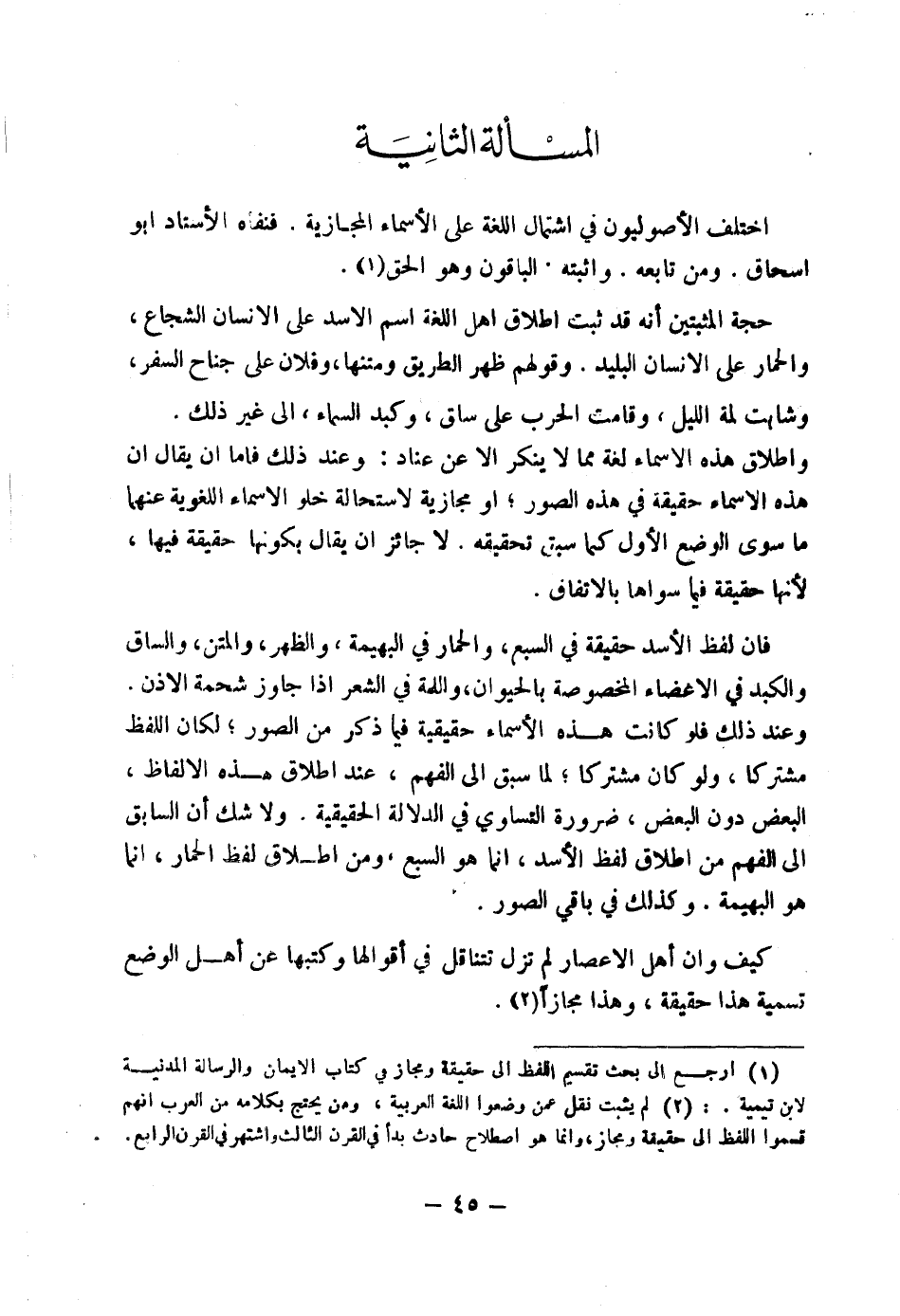 (١) ارْجِعْ إِلَى بَحْثِ تَقْسِيمِ اللَّفْظِ إِلَى حَقِيقَةٍ وَمَجَازٍ فِي كِتَابِ " الْإِيمَانِ " وَالرِّسَالَةِ الْمَدَنِيَّةِ لِابْنِ تَيْمِيَّةَ.