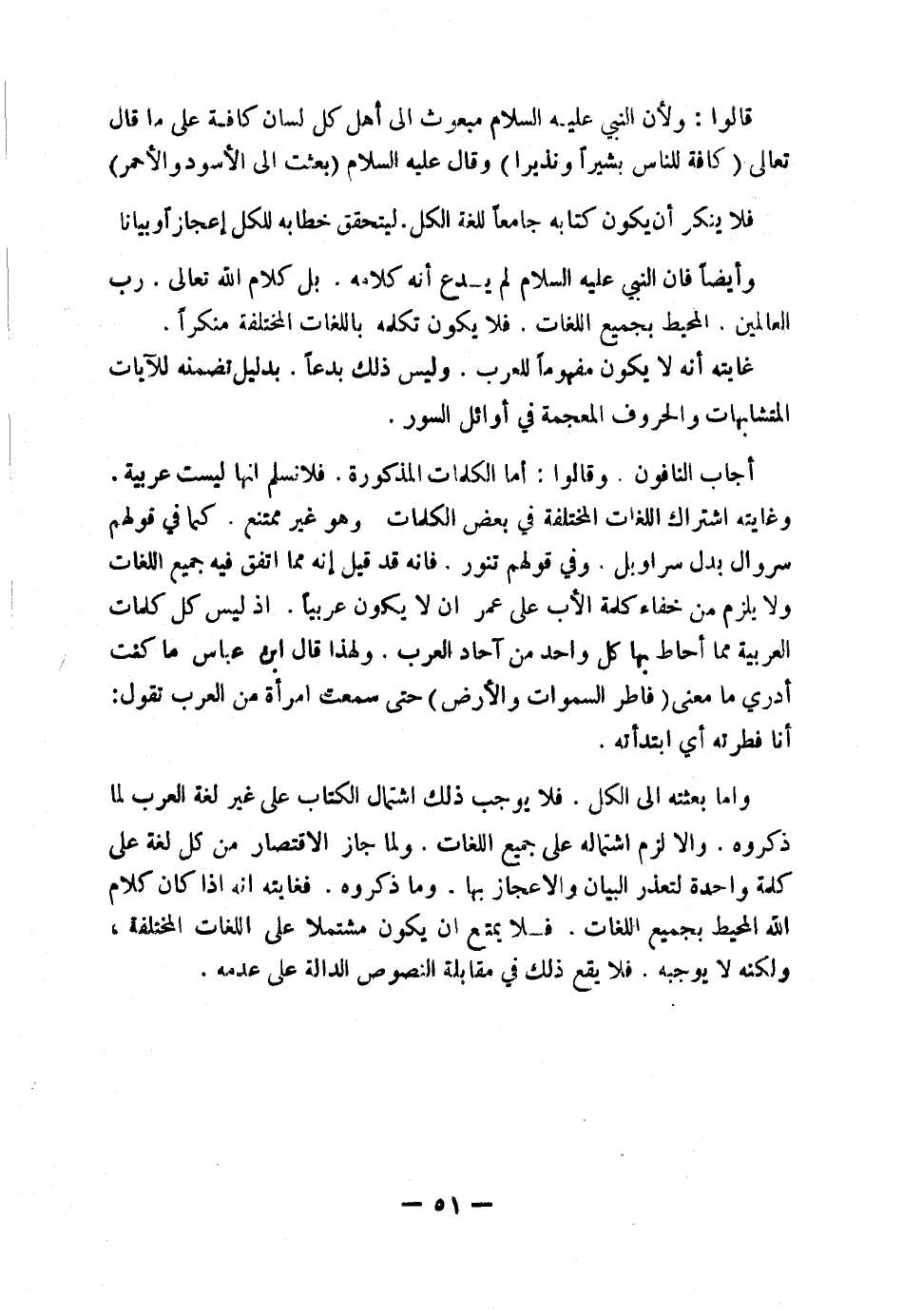 وَأَيْضًا فَإِنَّ النَّبِيَّ عَلَيْهِ السَّلَامُ لَمْ يَدَّعِ أَنَّهُ كَلَامُهُ بَلْ كَلَامُ اللَّهِ تَعَالَى رَبِّ الْعَالَمِينَ الْمُحِيطِ بِجَمِيعِ اللُّغَاتِ، فَلَا يَكُونُ تَكَلُّمُهُ بِاللُّغَاتِ الْمُخْتَلِفَةِ مُنْكَرًا، غَايَتُهُ أَنَّهُ لَا يَكُونُ مَفْهُومًا لِلْعَرَبِ، وَلَيْسَ ذَلِكَ بِدْعًا بِدَلِيلِ تَضَمُّنِهِ لِلْآيَاتِ الْمُتَشَابِهَاتِ وَالْحُرُوفِ الْمُعْجَمَةِ فِي أَوَائِلِ السُّوَرِ.