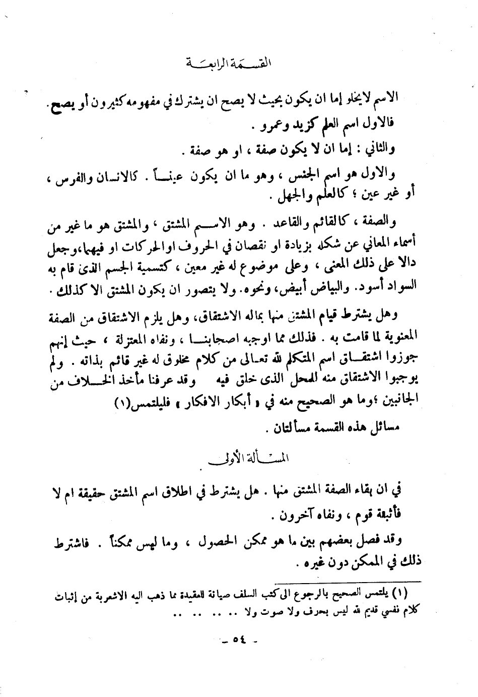 [الْقِسْمَةُ الرَّابِعَةُ الِاسْمُ لَا يَخْلُو إِمَّا أَنْ يَكُونَ بِحَيْثُ لَا يَصِحُّ أَنْ يَشْتَرِكَ فِي مَفْهُومِهِ كَثِيرُونَ أَوْ يَصِحُّ]