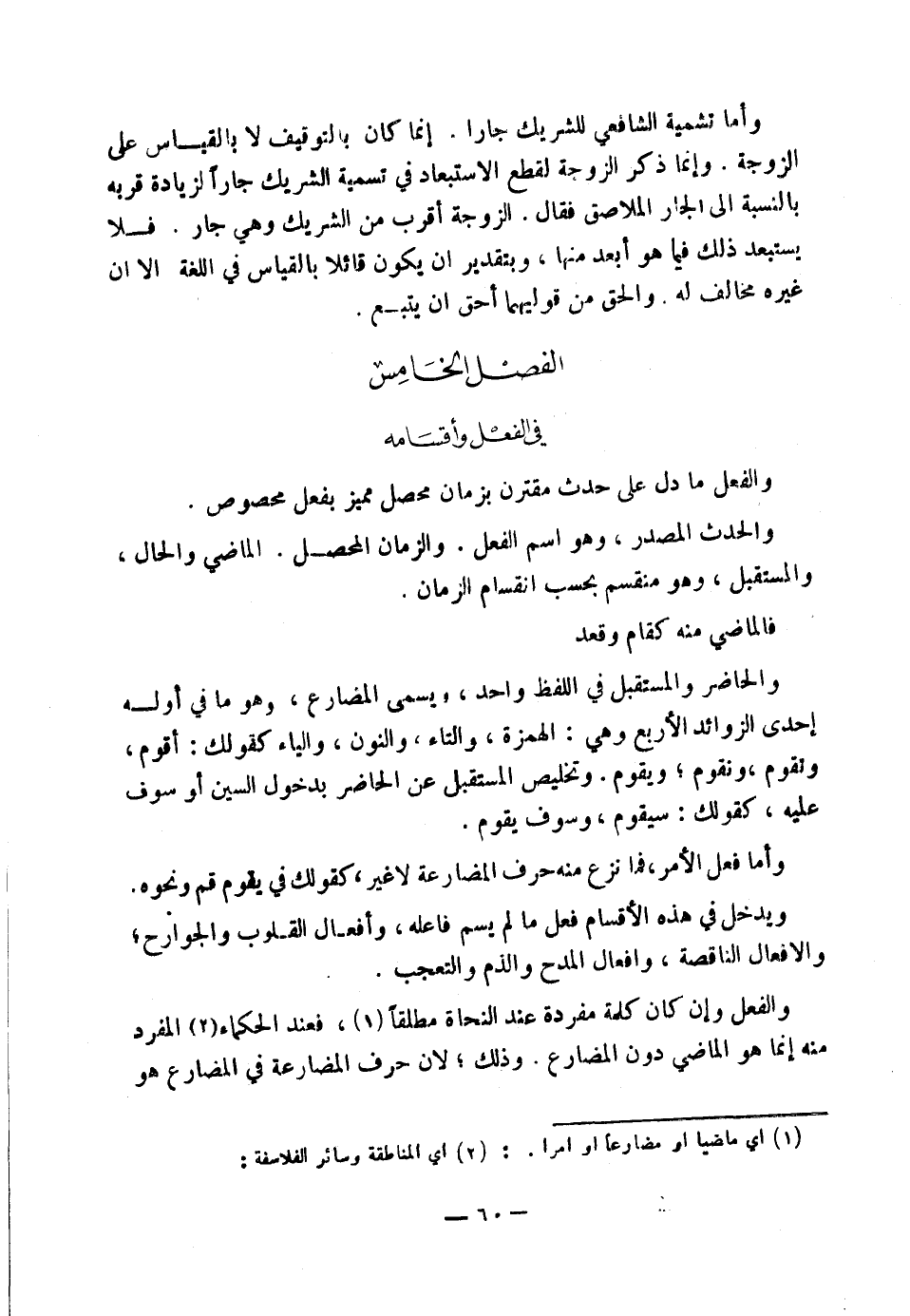 وَالْفِعْلُ وَإِنْ كَانَ كَلِمَةً مُفْرَدَةً عِنْدَ النُّحَاةِ مُطْلَقًا (١) ، فَعِنْدَ الْحُكَمَاءِ (٢) الْمُفْرَدُ مِنْهُ إِنَّمَا هُوَ الْمَاضِي دُونَ الْمُضَارِعِ، وَذَلِكَ لِأَنَّ حَرْفَ الْمُضَارَعَةِ فِي الْمُضَارِعِ هُوَ