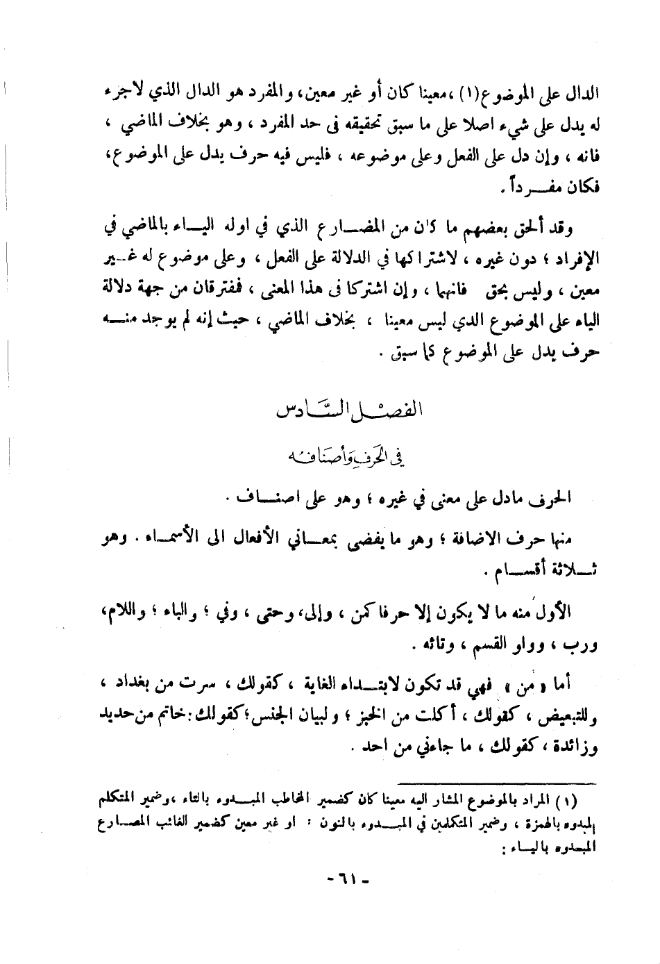 (١) الْمُرَادُ بِالْمَوْضُوعِ الْمُشَارِ إِلَيْهِ مُعَيَّنًا كَانَ: كَضَمِيرِ الْمُخَاطَبِ الْمَبْدُوءِ بِالتَّاءِ، وَضَمِيرِ الْمُتَكَلِّمِ الْمَبْدُوءِ بِالْهَمْزَةِ، وَضَمِيرِ الْمُتَكَلِّمِينَ فِي الْمَبْدُوءِ بِالنُّونِ. أَوْ غَيْرُ مُعَيَّنٍ: كَضَمِيرِ الْغَائِبِ الْمُضَارِعِ الْمَبْدُوءِ بِالْيَاءِ