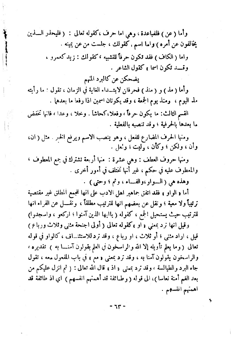وَمِنْهَا حُرُوفُ الْعَطْفِ وَهِيَ عَشَرَةٌ مِنْهَا أَرْبَعَةٌ تَشْتَرِكُ فِي جَمْعِ الْمَعْطُوفِ وَالْمَعْطُوفِ عَلَيْهِ فِي حُكْمٍ غَيْرَ أَنَّهَا تَخْتَلِفُ فِي أُمُورٍ أُخْرَى.