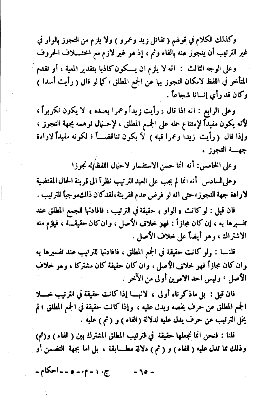 قُلْنَا: إِنَّمَا نَجْعَلُهَا حَقِيقَةً فِي التَّرْتِيبِ الْمُطْلَقِ الْمُشْتَرَكِ بَيْنَ (الْفَاءِ) وَ (ثُمَّ) وَذَلِكَ مِمَّا لَا تَدُلُّ عَلَيْهِ (الْفَاءُ) وَ (ثُمَّ) دَلَالَةً مُطَابِقَةً، بَلْ إِمَّا بِجِهَةِ التَّضَمُّنِ أَوْ