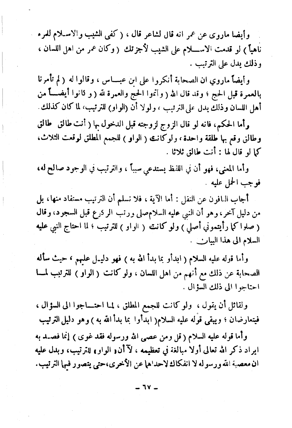 وَأَمَّا قَوْلُهُ عَلَيْهِ السَّلَامُ: ( «ابْدَؤُوا بِمَا بَدَأَ اللَّهُ بِهِ» ) فَهُوَ دَلِيلٌ عَلَيْهِمْ، حَيْثُ سَأَلَهُ الصَّحَابَةُ عَنْ ذَلِكَ مَعَ أَنَّهُمْ مِنْ أَهْلِ اللِّسَانِ، وَلَوْ كَانَتْ (الْوَاوُ) لِلتَّرْتِيبِ لَمَا احْتَاجُوا إِلَى ذَلِكَ السُّؤَالِ.