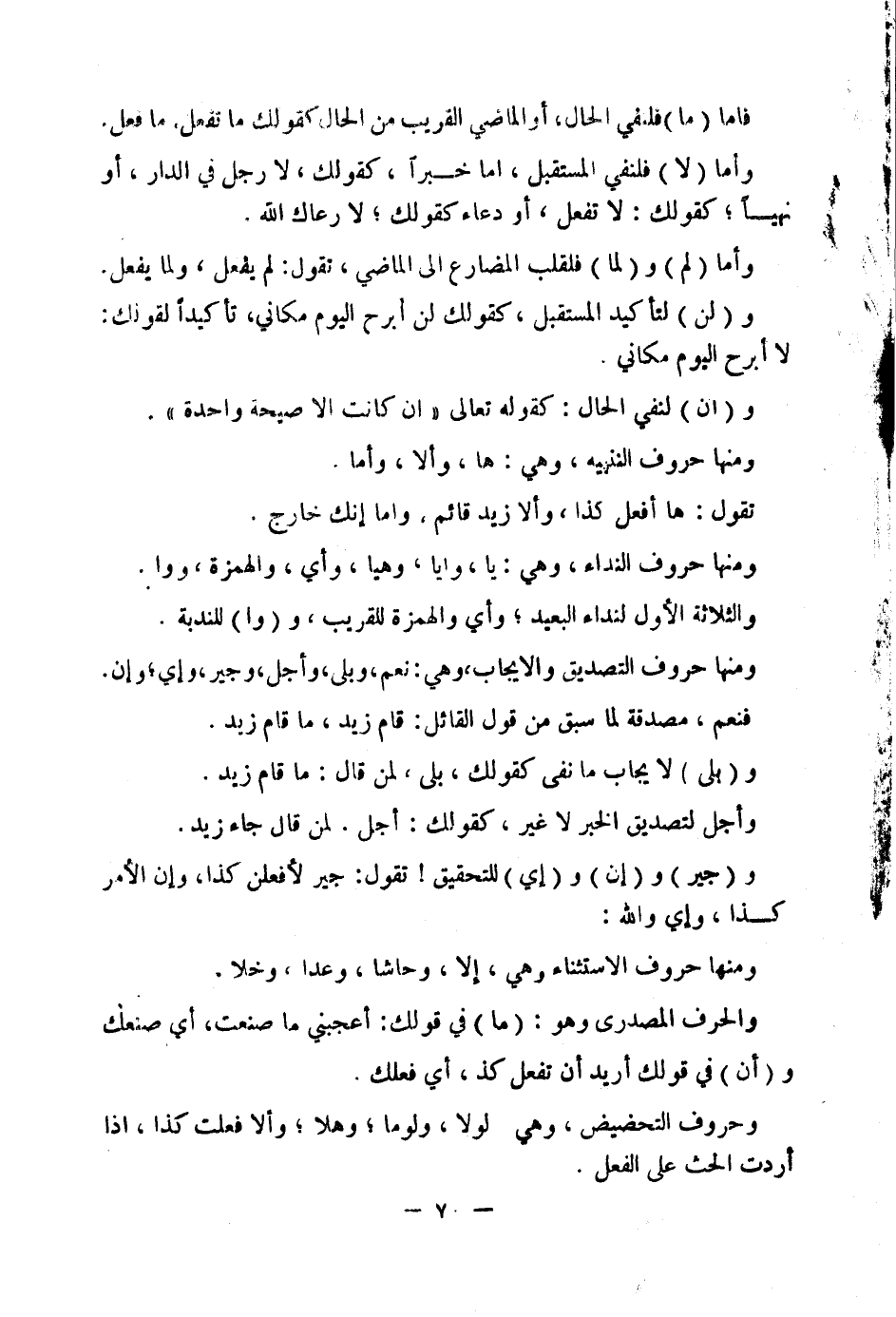وَأَمَّا (لَا) فَلِنَفْيِ الْمُسْتَقْبَلِ إِمَّا خَبَرًا كَقَوْلِكَ: لَا رَجُلَ فِي الدَّارِ، أَوْ نَهْيًا كَقَوْلِكَ: لَا تَفْعَلْ، أَوْ دُعَاءً كَقَوْلِكَ: لَا رَعَاكَ اللَّهُ.
