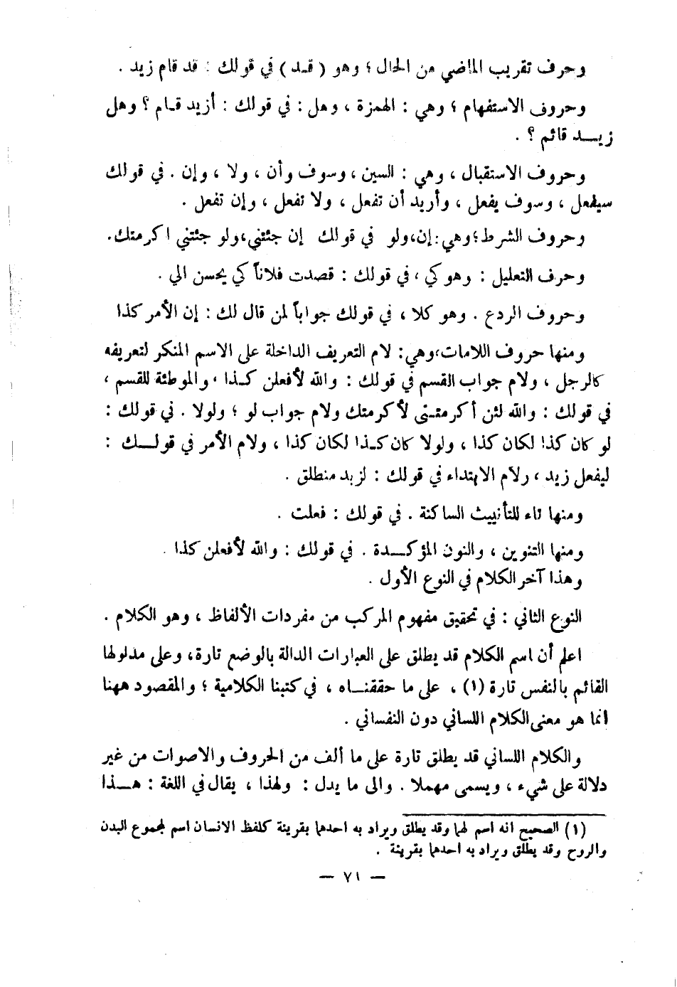 اعْلَمْ أَنَّ اسْمَ الْكَلَامِ قَدْ يُطْلَقُ عَلَى الْعِبَارَاتِ الدَّالَّةِ بِالْوَضْعِ تَارَةً وَعَلَى مَدْلُولِهَا الْقَائِمِ بِالنَّفْسِ تَارَةً (١) عَلَى مَا حَقَّقْنَاهُ فِي كُتُبِنَا الْكَلَامِيَّةِ، وَالْمَقْصُودُ هَاهُنَا إِنَّمَا هُوَ مَعْنَى الْكَلَامِ اللِّسَانِيِّ دُونَ النَّفْسَانِيِّ.