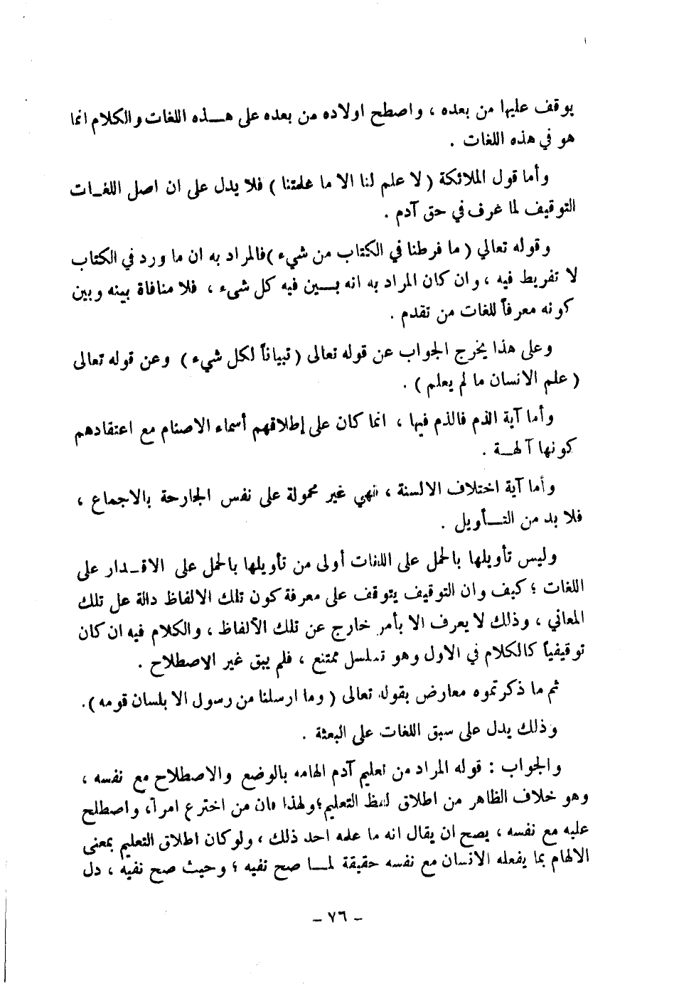 وَلَيْسَ تَأْوِيلُهَا بِالْحَمْلِ عَلَى اللُّغَاتِ أَوْلَى مِنْ تَأْوِيلِهَا بِالْحَمْلِ عَلَى الْإِقْدَارِ عَلَى اللُّغَاتِ، كَيْفَ وَأَنَّ التَّوْقِيفَ يَتَوَقَّفُ عَلَى مَعْرِفَةِ كَوْنِ تِلْكَ الْأَلْفَاظِ دَالَّةً عَلَى تِلْكَ الْمَعَانِي، وَذَلِكَ لَا يُعْرَفُ إِلَّا بِأَمْرٍ خَارِجٍ عَنْ تِلْكَ الْأَلْفَاظِ، وَالْكَلَامُ فِيهِ إِنْ كَانَ تَوْقِيفِيًّا كَالْكَلَامِ فِي الْأَوَّلِ وَهُوَ تَسَلْسُلٌ مُمْتَنِعٌ، فَلَمْ يَبْقَ غَيْرُ الِاصْطِلَاحِ.