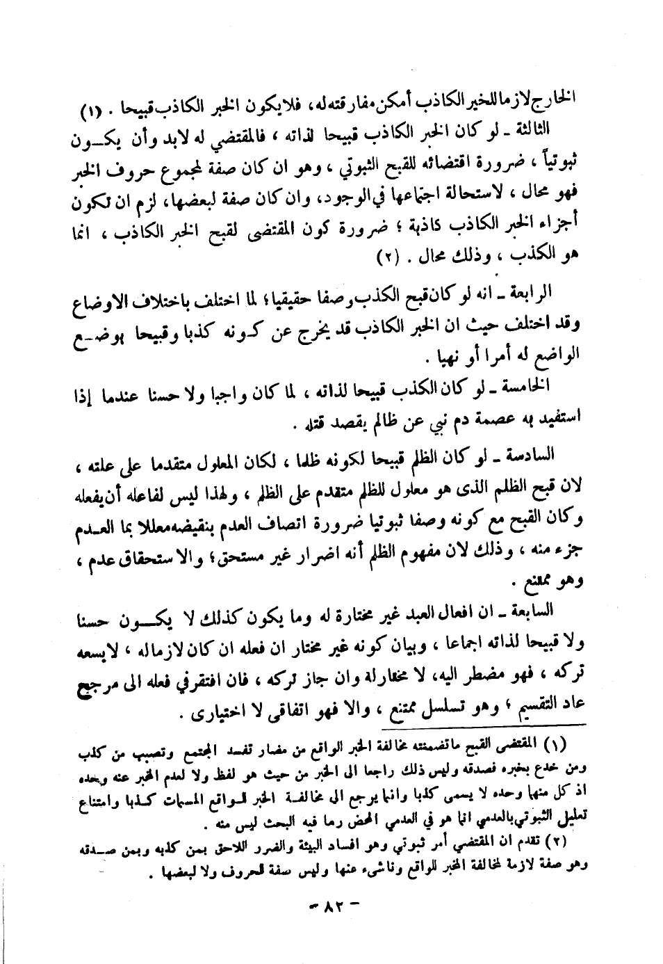 الْخَارِجُ لَازِمًا لِلْخَبَرِ الْكَاذِبِ أَمْكَنَ مُفَارَقَتُهُ لَهُ فَلَا يَكُونُ الْخَبَرُ الْكَاذِبُ قَبِيحًا. (١) الثَّالِثَةُ: لَوْ كَانَ الْخَبَرُ الْكَاذِبُ قَبِيحًا لِذَاتِهِ فَالْمُقْتَضِي لَهُ لَا بُدَّ وَأَنْ يَكُونَ ثُبُوتِيًّا ضَرُورَةَ اقْتِضَائِهِ لِلْقُبْحِ الثُّبُوتِيِّ، وَهُوَ إِنْ كَانَ صِفَةً لِمَجْمُوعِ حُرُوفِ الْخَبَرِ فَهُوَ مُحَالٌ ; لِاسْتِحَالَةِ اجْتِمَاعِهَا فِي الْوُجُودِ، وَإِنْ كَانَ صِفَةً لِبَعْضِهَا لَزِمَ أَنْ تَكُونَ أَجْزَاءُ الْخَبَرِ الْكَاذِبِ كَاذِبَةً ; ضَرُورَةَ كَوْنِ الْمُقْتَضِي لِقُبْحِ الْخَبَرِ الْكَاذِبِ إِنَّمَا هُوَ الْكَذِبُ، وَذَلِكَ مُحَالٌ. (٢) الرَّابِعَةُ: أَنَّهُ لَوْ كَانَ قُبْحُ الْكَذِبِ وَصْفًا حَقِيقِيًّا لَمَا اخْتَلَفَ بِاخْتِلَافِ الْأَوْضَاعِ، وَقَدِ اخْتَلَفَ حَيْثُ إِنَّ الْخَبَرَ الْكَاذِبَ قَدْ يَخْرُجُ عَنْ كَوْنِهِ كَذِبًا وَقَبِيحًا بِوَضْعِ الْوَاضِعِ لَهُ أَمْرًا أَوْ نَهْيًا.