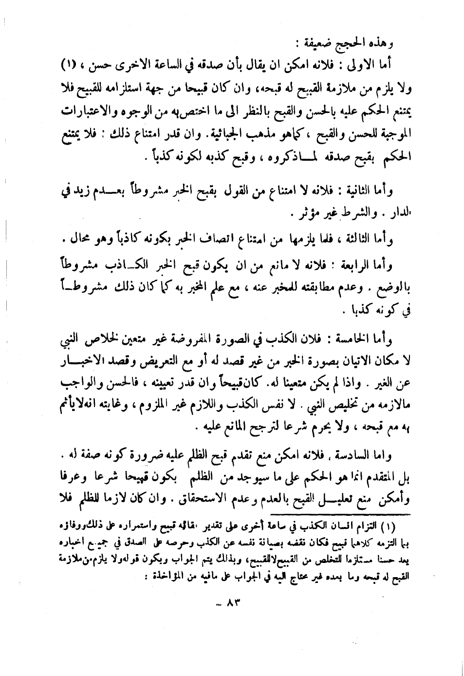 (١) الْتِزَامُ إِنْسَانٍ الْكَذِبَ فِي سَاعَةٍ أُخْرَى عَلَى تَقْدِيرِ بَقَائِهِ قَبِيحٌ وَاسْتِمْرَارُهُ عَلَى ذَلِكَ وَوَفَاؤُهُ بِمَا الْتَزَمَهُ كِلَاهُمَا قَبِيحٌ، فَكَانَ نَقْضُهُ صِيَانَةَ نَفْسِهِ عَنِ الْكَذِبِ وَحِرْصَهُ عَلَى الصِّدْقِ فِي جَمِيعِ أَخْبَارِهِ يُعَدُّ حَسَنًا مُسْتَلْزِمًا التَّخَلُّصَ مِنَ الْقَبِيحِ لَا لِلْقَبِيحِ، وَبِذَلِكَ يَتِمُّ الْجَوَابُ، وَيَكُونُ قَوْلُهُ: وَلَا يَلْزَمُ مِنْ مُلَازَمَةِ الْقُبْحِ لَهُ قُبْحُهُ. وَمَا بَعْدَهُ غَيْرُ مُحْتَاجٍ إِلَيْهِ فِي الْجَوَابِ عَلَى مَا فِيهِ مِنَ الْمُؤَاخَذَةِ