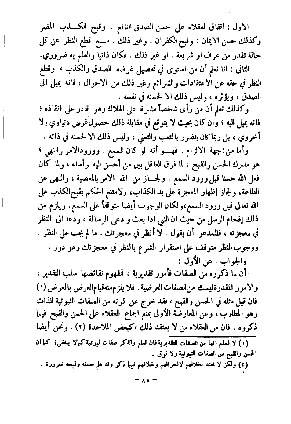 وَالْجَوَابُ عَنِ الْأَوَّلِ: أَنَّ مَا ذَكَرُوهُ فَأُمُورٌ تَقْدِيرِيَّةٌ، فَمَفْهُومُ نَقَائِضِهَا سَلْبُ التَّقْدِيرِ، وَالْأُمُورُ الْمُقَدَّرَةُ لَيْسَتْ مِنَ الصِّفَاتِ الْعَرَضِيَّةِ، فَلَا يَلْزَمُ مِنْهُ قِيَامُ الْعَرَضِ بِالْعَرَضِ. (١) فَإِنْ قِيلَ مِثْلُهُ فِي الْحُسْنِ وَالْقُبْحِ، فَقَدْ خَرَجَ عَنْ كَوْنِهِ مِنَ الصِّفَاتِ الثُّبُوتِيَّةِ لِلذَّاتِ وَهُوَ الْمَطْلُوبُ، وَعَنِ الْمُعَارَضَةِ الْأُولَى بِمَنْعِ إِجْمَاعِ الْعُقَلَاءِ عَلَى الْحُسْنِ وَالْقُبْحِ فِيمَا ذَكَرُوهُ، فَإِنَّ مِنَ الْعُقَلَاءِ مَنْ لَا يَعْتَقِدُ ذَلِكَ، كَبَعْضِ الْمَلَاحِدَةِ (٢) ، وَنَحْنُ أَيْضًا