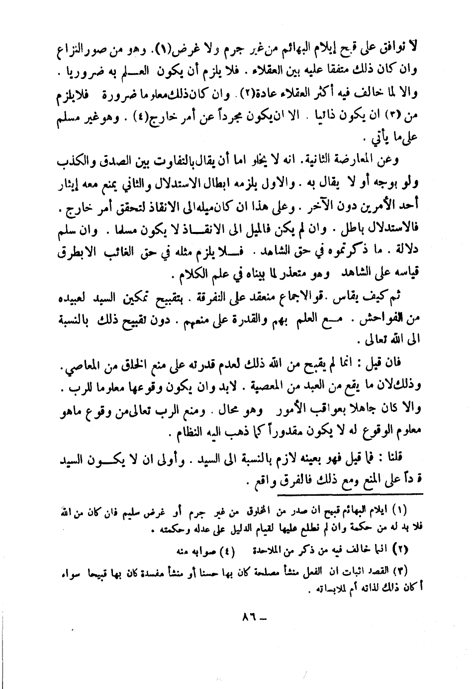 (١) إِيلَامُ الْبَهَائِمِ إِنْ صَدَرَ مِنَ الْمَخْلُوقِ مِنْ غَيْرِ جُرْمٍ أَوْ غَرَضٍ، سَلِيمٌ، فَإِنْ كَانَ مِنَ اللَّهِ، فَلَا بُدَّ لَهُ مِنْ حِكْمَةٍ، وَإِنْ لَمْ نَطَّلِعْ عَلَيْهَا لِقِيَامِ الدَّلِيلِ عَلَى عَدْلِهِ وَحِكْمَتِهِ.