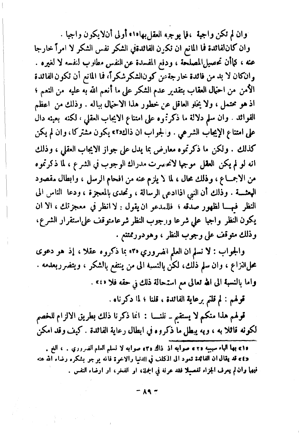 وَإِنْ كَانَ لِفَائِدَةٍ فَمَا الْمَانِعُ أَنْ تَكُونَ الْفَائِدَةُ فِي الشُّكْرِ نَفْسَ الشُّكْرِ لَا أَمْرًا خَارِجًا عَنْهُ، كَمَا أَنَّ تَحْصِيلَ الْمَصْلَحَةِ وَدَفْعَ الْمَفْسَدَةِ عَنِ النَّفْسِ مَطْلُوبٌ لِنَفْسِهِ لَا لِغَيْرِهِ، وَإِنْ كَانَ لَا بُدَّ مِنْ فَائِدَةٍ خَارِجَةٍ عَنْ كَوْنِ الشُّكْرِ شُكْرًا فَمَا الْمَانِعُ أَنْ تَكُونَ الْفَائِدَةُ الْأَمْنَ مِنِ احْتِمَالِ الْعِقَابِ بِتَقْدِيرِ عَدَمِ الشُّكْرِ عَلَى مَا أَنْعَمَ اللَّهُ بِهِ عَلَيْهِ مِنَ النِّعَمِ ; إِذْ هُوَ مُحْتَمَلٌ وَلَا يَخْلُو الْعَاقِلُ عَنْ خُطُورِ هَذَا بِبَالِهِ، وَذَلِكَ مِنْ أَعْظَمِ الْفَوَائِدِ، وَإِنْ سُلِّمَ دَلَالَةُ مَا ذَكَرْتُمُوهُ عَلَى امْتِنَاعِ الْإِيجَابِ الْعَقْلِيِّ لَكِنَّهُ بِعَيْنِهِ دَالٌّ عَلَى امْتِنَاعِ الْإِيجَابِ الشَّرْعِيِّ، وَالْجَوَابُ أَنَّ ذَاكَ (٢) يَكُونُ مُشْتَرَكًا وَإِنْ لَمْ يَكُنْ كَذَلِكَ.