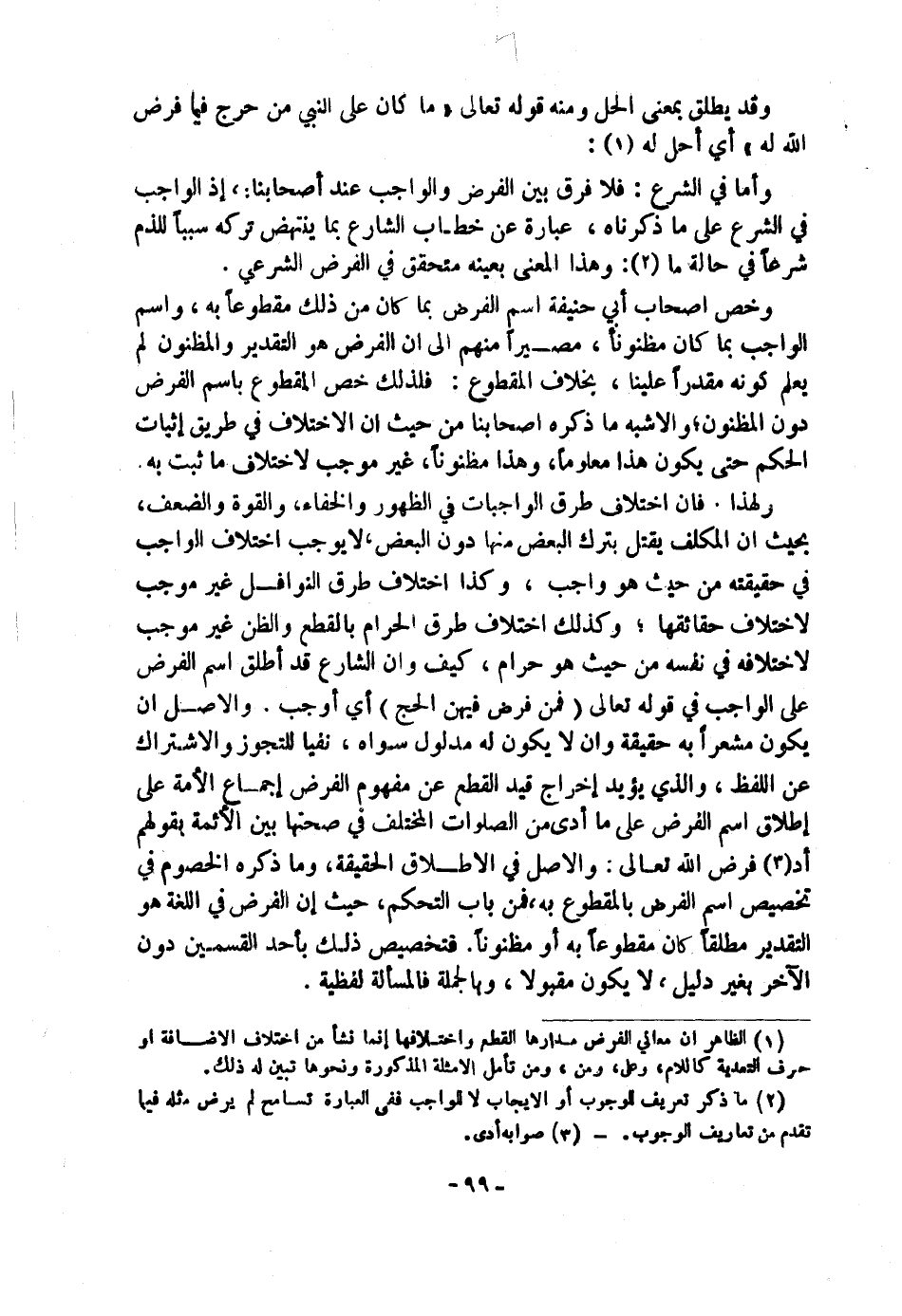وَلِهَذَا فَإِنَّ اخْتِلَافَ طُرُقِ الْوَاجِبَاتِ فِي الظُّهُورِ وَالْخَفَاءِ وَالْقُوَّةِ وَالضَّعْفِ، بِحَيْثُ إِنَّ الْمُكَلَّفَ يُقْتَلُ بِتَرْكِ الْبَعْضِ مِنْهَا دُونَ الْبَعْضِ، لَا يُوجِبُ اخْتِلَافَ الْوَاجِبِ فِي حَقِيقَتِهِ مِنْ حَيْثُ هُوَ وَاجِبٌ، وَكَذَا اخْتِلَافُ طُرُقِ النَّوَافِلِ غَيْرُ مُوجِبٍ لِاخْتِلَافِ حَقَائِقِهَا، وَكَذَلِكَ اخْتِلَافُ طُرُقِ الْحَرَامِ بِالْقَطْعِ وَالظَّنِّ غَيْرُ مُوجِبٍ لِاخْتِلَافِهِ فِي نَفْسِهِ مِنْ حَيْثُ هُوَ حَرَامٌ، كَيْفَ وَإِنَّ الشَّارِعَ قَدْ أَطْلَقَ اسْمَ الْفَرْضِ عَلَى الْوَاجِبِ فِي قَوْلِهِ تَعَالَى: {فَمَنْ فَرَضَ فِيهِنَّ الْحَجَّ} أَيْ أَوْجَبَ، وَالْأَصْلُ أَنْ يَكُونَ مُشْعِرًا بِهِ حَقِيقَةً وَأَنْ لَا يَكُونَ لَهُ مَدْلُولٌ سِوَاهُ نَفْيًا لِلتَّجَوُّزِ وَالِاشْتِرَاكِ عَنِ اللَّفْظِ، وَالَّذِي يُؤَيِّدُ إِخْرَاجَ قَيْدِ الْقَطْعِ عَنْ مَفْهُومِ الْفَرْضِ إِجْمَاعُ الْأُمَّةِ عَلَى إِطْلَاقِ اسْمِ الْفَرْضِ عَلَى مَا أَدَّى مِنَ الصَّلَوَاتِ الْمُخْتَلَفِ فِي صِحَّتِهَا بَيْنَ الْأَئِمَّةِ بِقَوْلِهِمْ: أَدِّ (٣) فَرْضَ اللَّهِ تَعَالَى، وَالْأَصْلُ فِي الْإِطْلَاقِ الْحَقِيقَةُ، وَمَا ذَكَرَهُ الْخُصُومُ فِي تَخْصِيصِ اسْمِ الْفَرْضِ الْمَقْطُوعِ بِهِ فَمِنْ بَابِ التَّحَكُّمِ حَيْثُ إِنَّ الْفَرْضَ فِي اللُّغَةِ هُوَ التَّقْدِيرُ مُطْلَقًا، كَانَ مَقْطُوعًا بِهِ أَوْ مَظْنُونًا، فَتَخْصِيصُ ذَلِكَ بِأَحَدِ الْقِسْمَيْنِ دُونَ الْآخَرِ بِغَيْرِ دَلِيلٍ لَا يَكُونُ مَقْبُولًا، وَبِالْجُمْلَةِ فَالْمَسْأَلَةُ لَفْظِيَّةٌ.