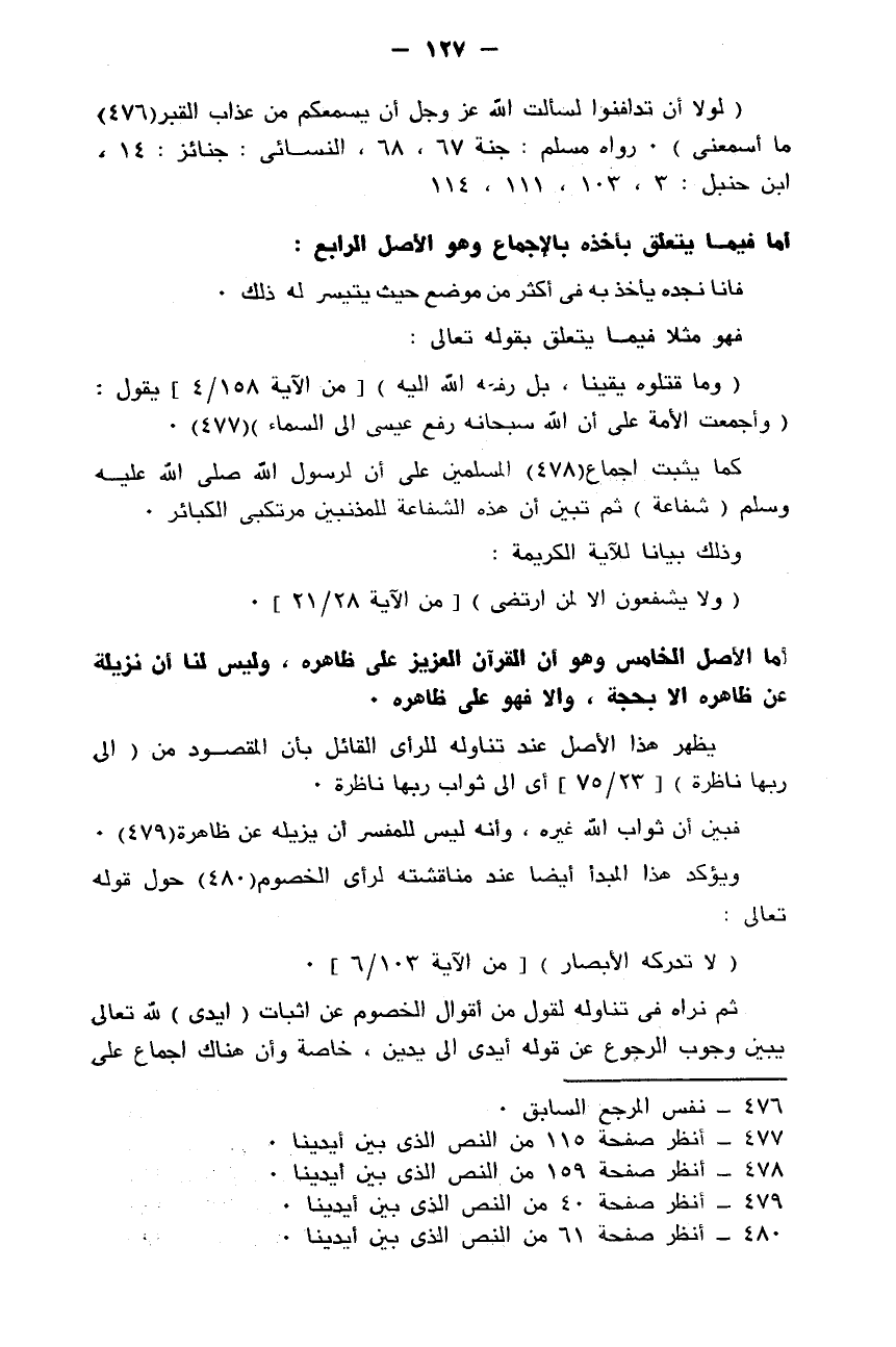 ويعني النعمة؛ بطل أن يكون معنى قوله تعالى: (بيدي) النعمة، وذلك أنه لا يجوز أن يقول القائل: لي عليه يدي، بمعنى لي عليه نعمتي، ومن دافعنا عن استعمال اللغة ولم يرجع إلى أهل اللسان فيها دوفع عن أن تكون اليد بمعنى النعمة؛ إذ كان لا يمكنه أن يتعلق في أن اليد النعمة إلا من جهة اللغة، فإذا دفع اللغة لزمه أن لا يفسر القرآن من جهتها، وأن لا يثبت اليد نعمة من قبلها؛ لأنه إن روجع في تفسير قوله تعالى: (بيدي) نعمتي فليس المسلمون على ما ادعى متفقين، وإن روجع إلى