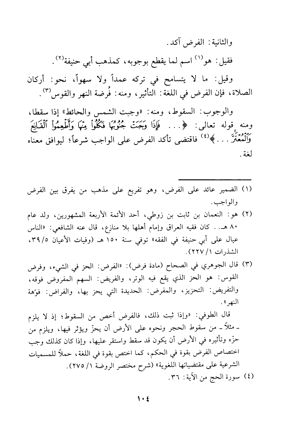 وقيل: ما لا يتسامح في تركه عمدًا ولا سهوًا، نحو: أركان الصلاة، فإن الفرض في اللغة: التأثير، ومنه فُرضة النهر والقوس3.