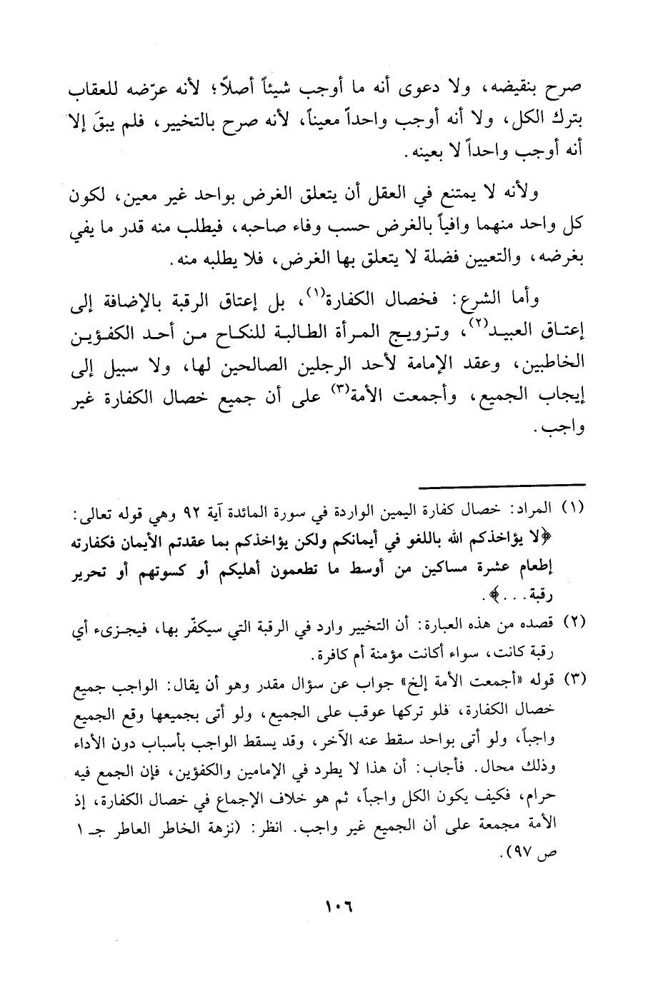 3 قوله "أجمعت الأمة إلخ" جواب عن سؤال مقدر، وهو أن يقال: الواجب جميع خصال الكفارة، فلو تركها عوقب على الجميع، ولو أتى بجميعها وقع الجميع واجبًا، ولو أتى بواحد سقط عنه الآخر، وقد يسقط الواجب بأسباب دون الأداء وذلك محال. فأجاب: أن هذا لا يطرد في الإمامين والكفؤين، فإن الجمع فيه حرام، فكيف يكون الكل واجبًا، ثم هو خلاف الإجماع في خصال الكفارة، إذ الأمة مجمعة على أن الجميع غير واجب. انظر: "نزهة الخاطر العاطر جـ1 ص97".