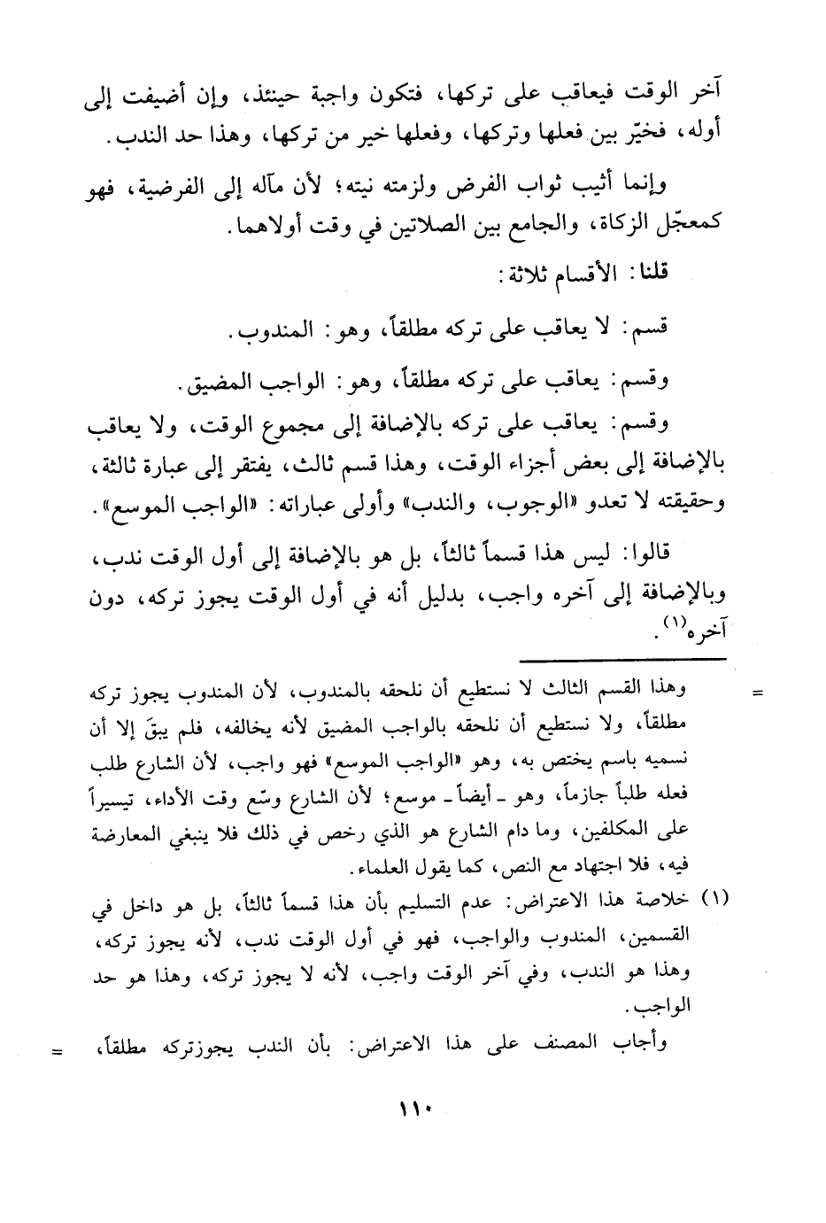 1 خلاصة هذا الاعتراض: عدم التسليم بأن هذا قسم ثالث، بل هو داخل في القسمين، المندوب والواجب، فهو في أول الوقت ندب، لأنه يجوز تركه، وهذا هو الندب، وفي آخر الوقت واجب، لأنه لا يجوز تركه، وهذا هو حد الواجب.