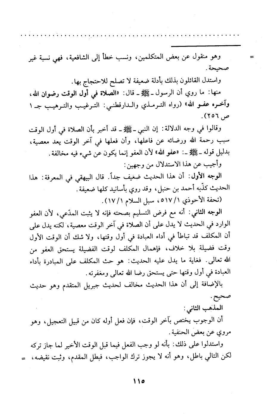 الوجه الثاني: أنه مع فرض التسليم بصحته فإنه لا يثبت المدّعي، لأن العفو الوارد في الحديث لا يدل على أن الصلاة في آخر الوقت معصية، لكنه يلج على أن المكلف قد تباطأ في أداء العبادة في أول وقتها، ولا شك أن الوقت الأول وقت فضيلة بلا خلاف، فإهمال لوقت الفضيلة يستحق العفو من الله تعالى. فغاية ما يدل عليه الحديث: هو حث المكلف على المبادرة بأداء العبادة في أول وقتها حتى يستحق رضا الله تعالى ومغفرته.
