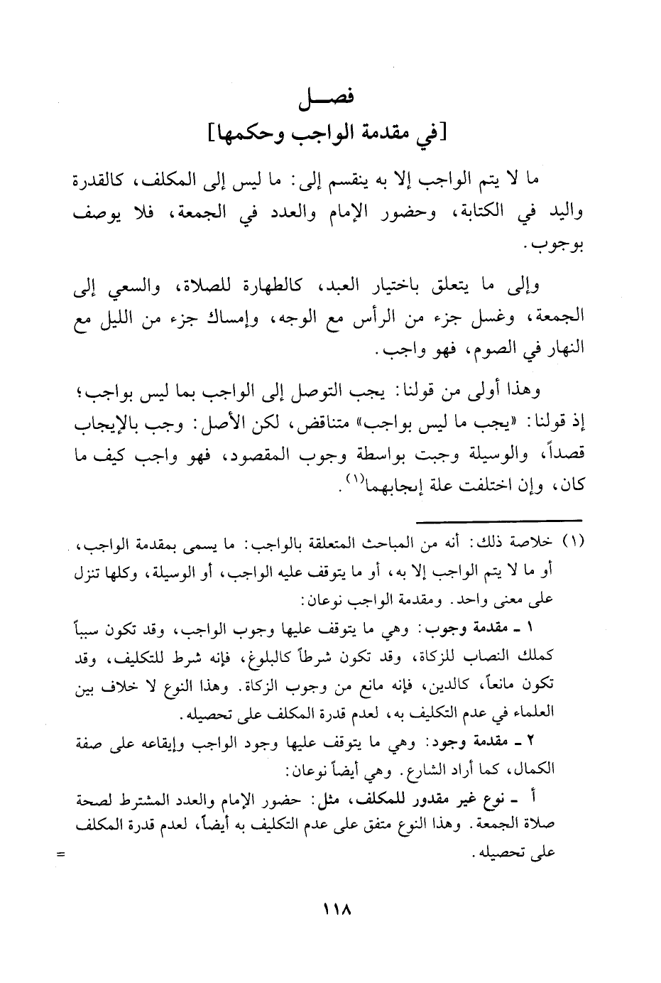 1 خلاصة ذلك: أنه من المباحث المتعلقة بالواجب: ما يسمى بمقدمة الواجب، أو ما لا يتم الواجب إلا به، أو ما يتوقف عليه الواجب، أو الوسيلة، وكلها تنزل على معنى واحد. ومقدمة الواجب نوعان: