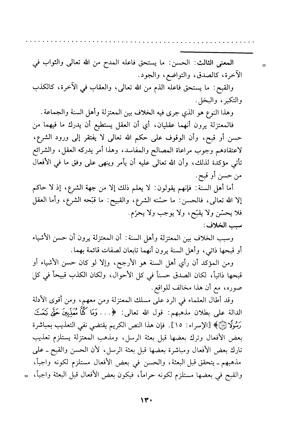 وسبب الخلاف بين المعتزلة وأهل السنة: أن المعتزلة يرون أن حسن الأشياء أو قبحها ذاتي، وأهل السنة يرون أنهما تابعان لصفات قائمة بهما.