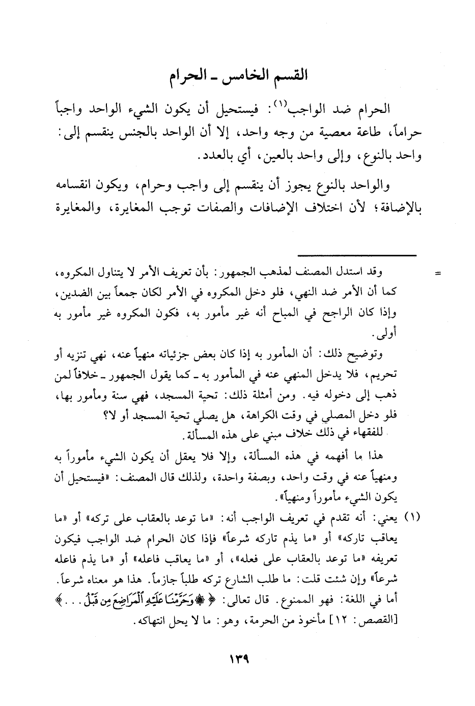 الحرام ضد الواجب1: فيستحيل أن يكون الشيء الواحد واجبًا حرامًا، طاعة معصية من وجه واحد، إلا أن الواحد بالجنس ينقسم إلى: واحد بالنوع، وإلى واحد بالعين، أي بالعدد.