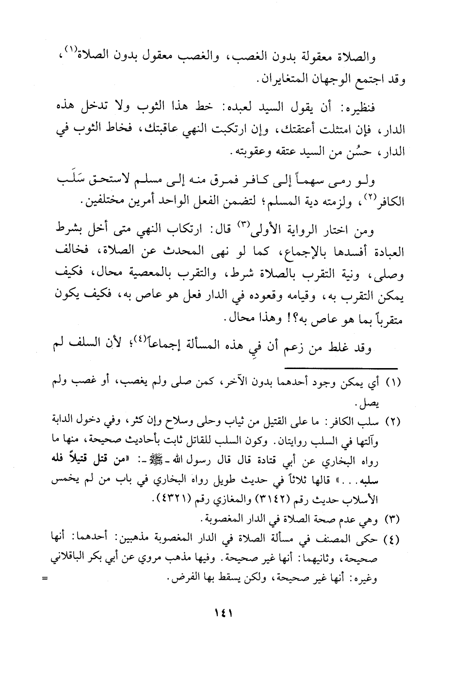 4 حكى المصنف في مسألة الصلاة في الدار المغصوبة مذهبين: أحدهما: أنها صحيحة، وثانيهما: أنهما غير صحيحة. وفيها مذهب مروي عن أبي بكر الباقلاني وغيره: أنها غير صحيحة، ولكن يسقط بها الفرض. =