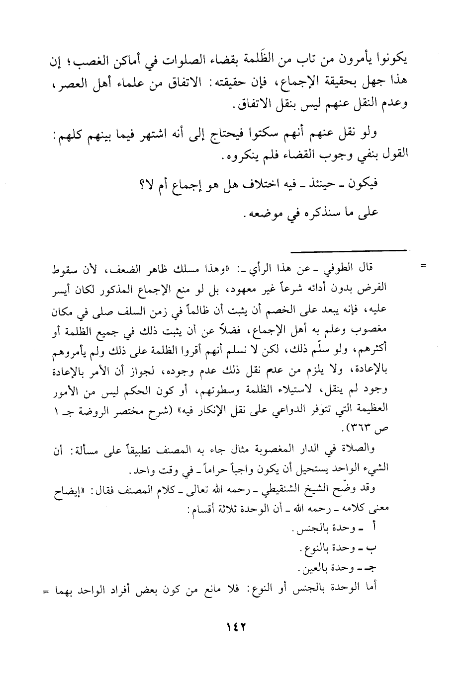 قال الطوفي -عن هذا الرأي-: "وهذا مسلك ظاهر الضعف، لأن سقوط الفرض بدون أدائه شرعًا غير معهود، بل لو منع الإجماع المذكور لكان أيسر عليه، فإنه يبعد على الخصم أن يثبت أن ظالمًا في زمن السلف صلى في مكان مغصوب وعلم به أهل الإجماع، فضلًا عن أن يثبت ذلك في جميع الظلمة أو أكثرهم، ولو سلّم ذلك، لكن لا نسلم أنهم أقروا الظلمة على ذلك ولم يأمروهم بالإعادة، ولا يلزم من عدم نقل ذلك عدم وجوده، لجواز أن الأمر بالإعادة وجود لم ينقل، لاستيلاء الظلمة وسطوتهم، أو كون الحكم ليس من الأمور العظيمة التي تتوفر الدواعي على نقل الإنكار فيه" "شرح مختصر الروضة جـ1 ص363".
