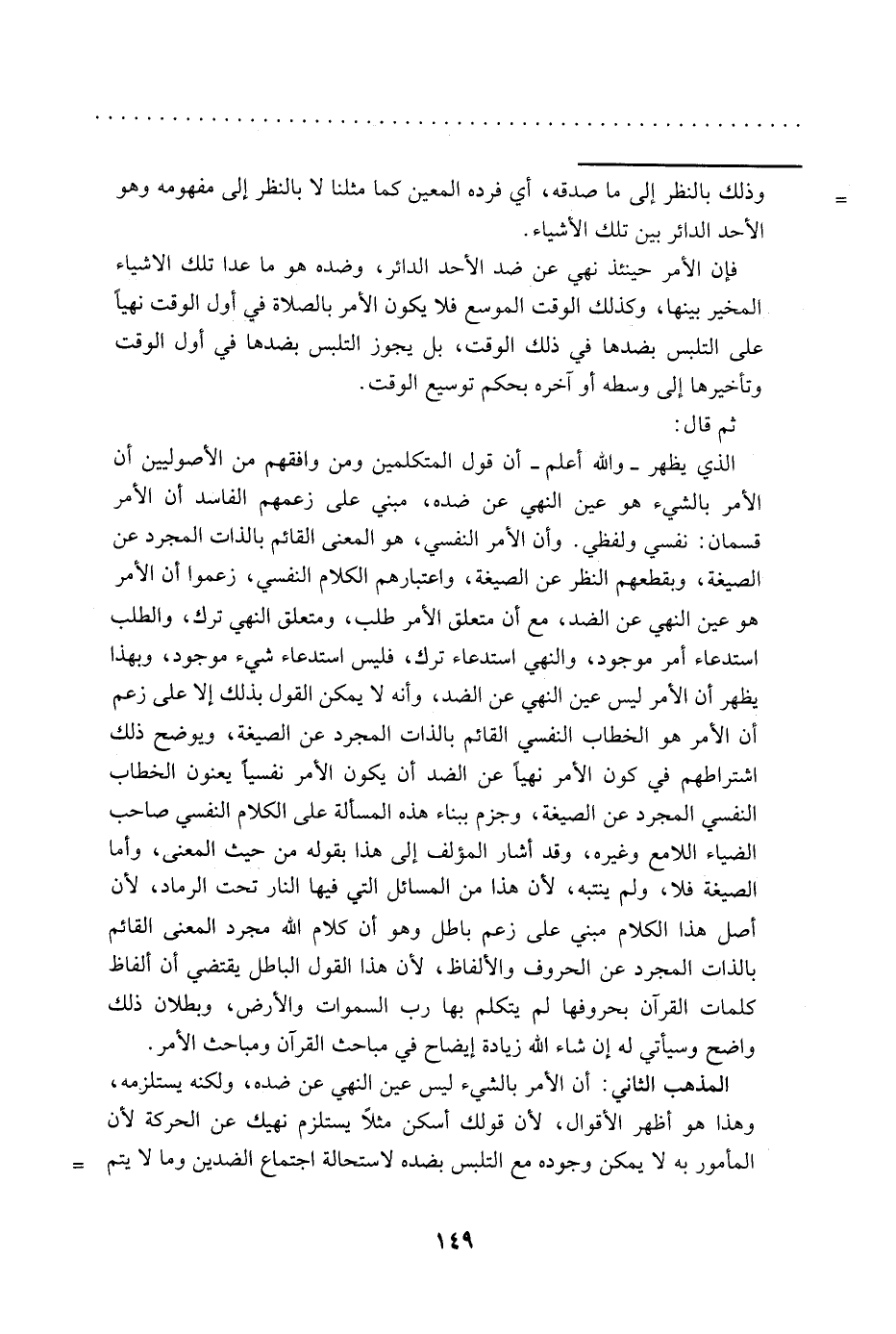 فإن الأمر حينئذ نهي عن ضد الأحد الدائر، وضده هو ما عدا تلك الأشياء المخير بينها، وكذلك الوقت الموسع فلا يكون الأمر بالصلاة في أول الوقت نهيًا على التلبس بضدها في ذلك الوقت، بل يجوز التلبس بضدها في أول الوقت وتأخيرها إلى وسطه أو آخره بحكم توسيع الوقت.