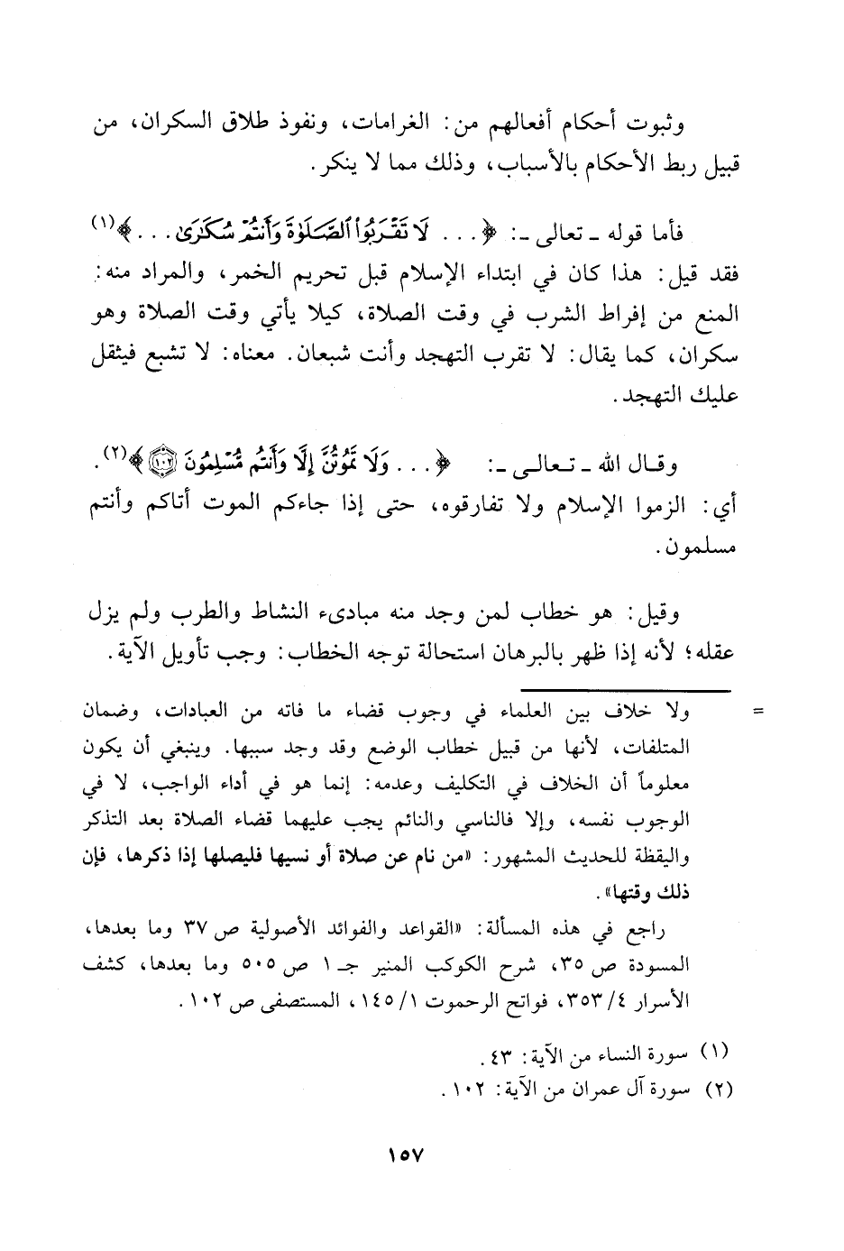 فأما قوله تعالى: {لا تَقْرَبُوا الصَّلاةَ وَأَنْتُمْ سُكَارَى} 1 فقد قيل: هذا كان في ابتداء الإسلام قبل تحريم الخمر، والمراد منه: المنع من إفراط الشرب في وقت الصلاة، كيلا يأتي عليه وقت الصلاة وهو سكران، كما يقال: لا تقرب التهجد وأنت شبعان. معناه لا تشبع فيثقل عليك التهجد.