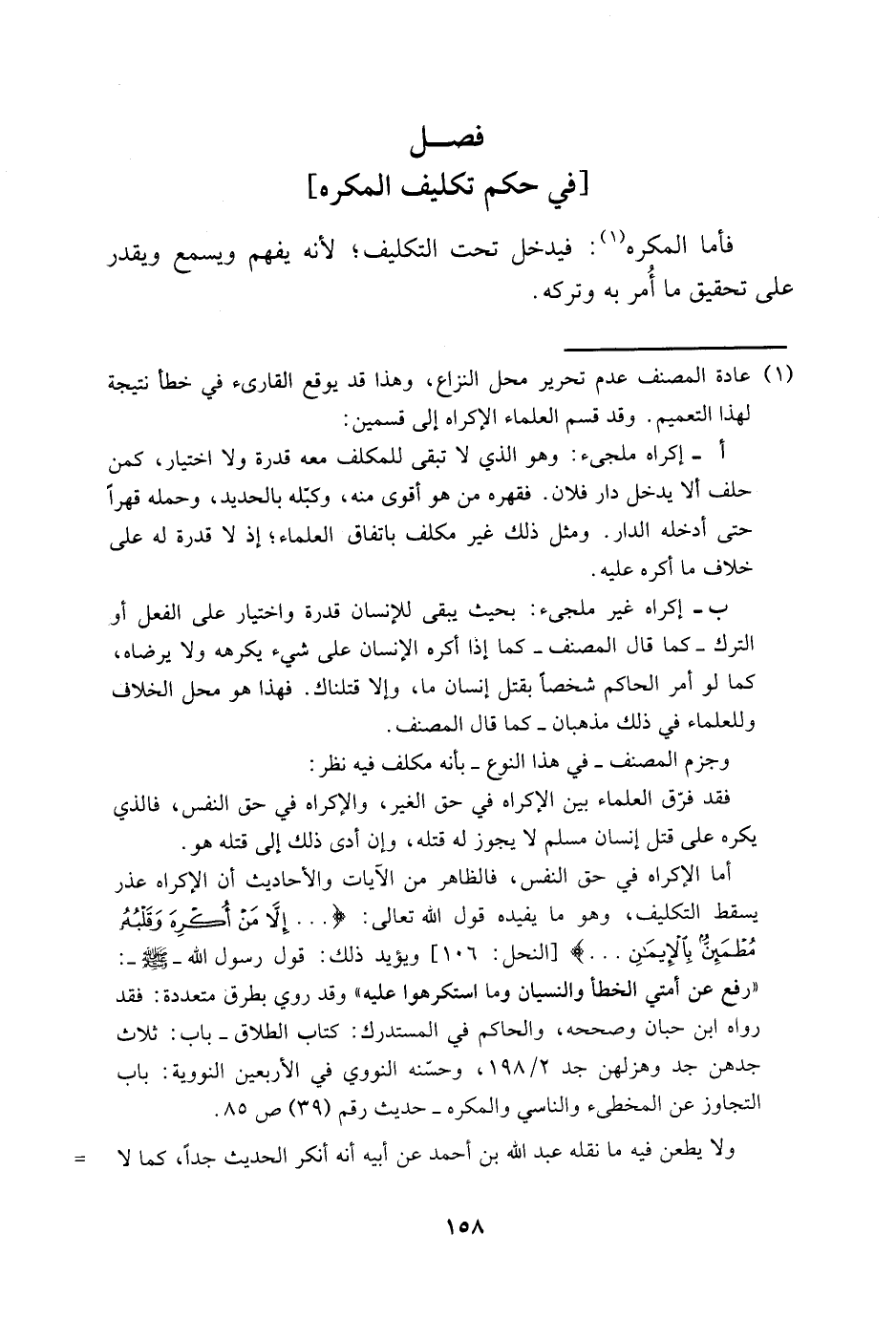 1 عادة المصنف عدم تحرير محل النزاع، وهذا قد يوقع القارئ في خطأ نتيجة لهذا التعميم. وقد قسم العلماء الإكراه إلى قسمين: