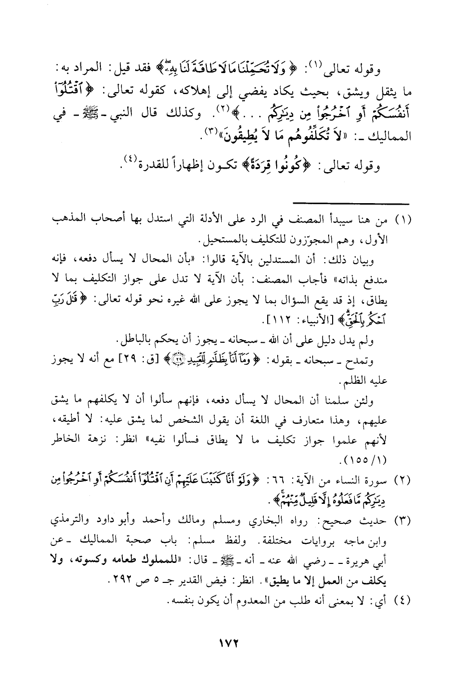 وقوله تعالى 1: {وَلا تُحَمِّلْنَا مَا لا طَاقَةَ لَنَا بِه} فقد قيل: المراد به: ما يثقل ويشق، بحيث يكاد يفضي إلى إهلاكه، كقوله تعالى: {اقْتُلُوا أَنْفُسَكُمْ أَوِ اخْرُجُوا مِنْ دِيَارِكُم} 2. وكذلك قال النبي -صلى الله عليه وسلم- في المماليك: "لا تكلفوهم ما لا يطيقون" 3.