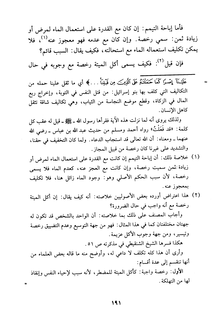 2 هذا اعتراض أورده بعض الأصوليين خلاصته: أنه كيف يقال: إن أكل الميتة رخصة مع أنه واجب في حال الضرورة.